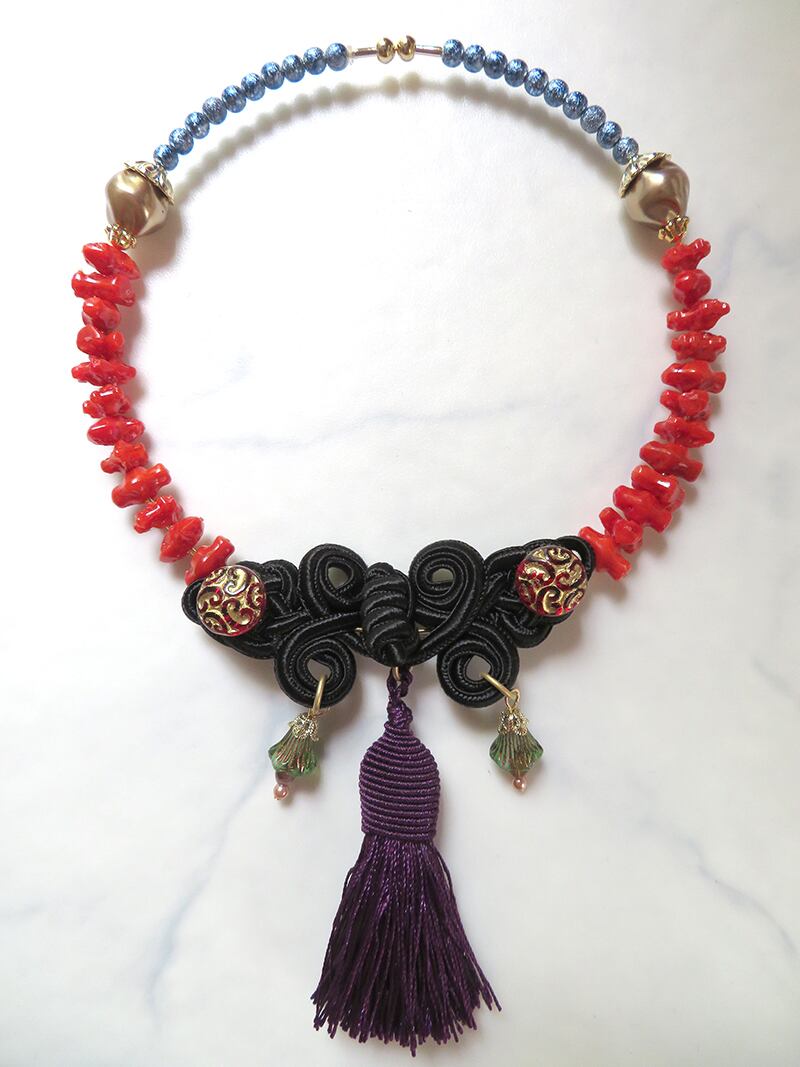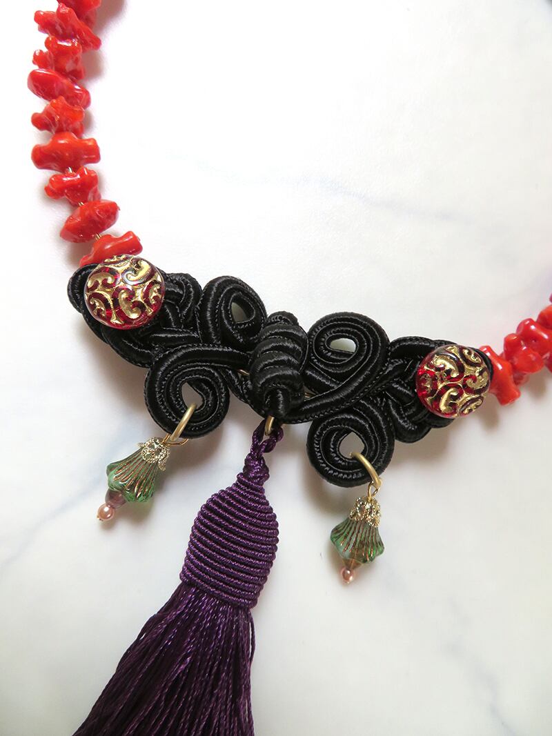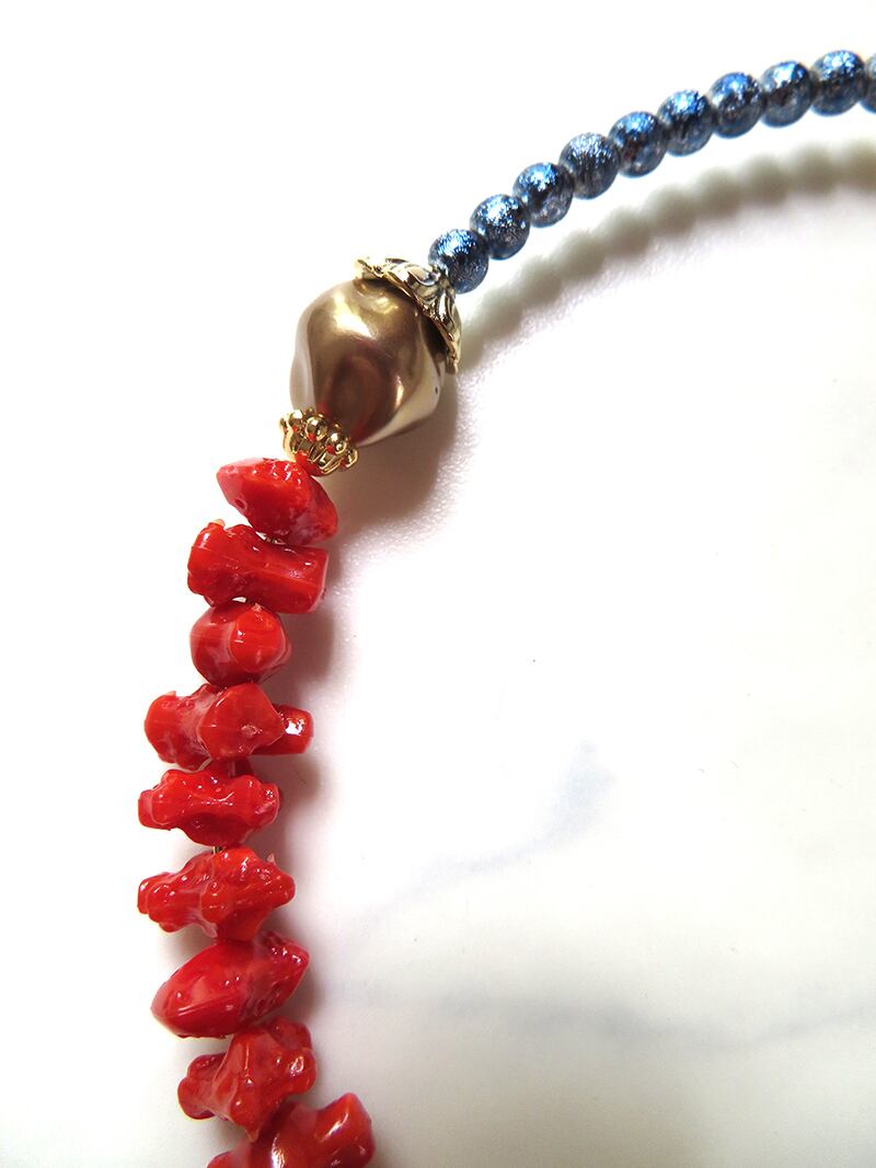 チャイナボタンやフェイク珊瑚等をつなぎ合わせて、360度どこから見ても違った可愛さが出る様に制作しました。