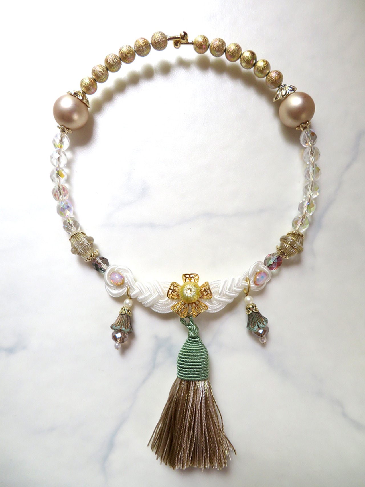 チャイナボタンやフェイク珊瑚等をつなぎ合わせて、360度どこから見ても違った可愛さが出る様に制作しました。
