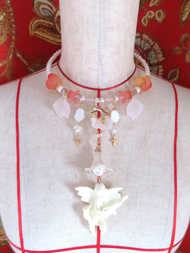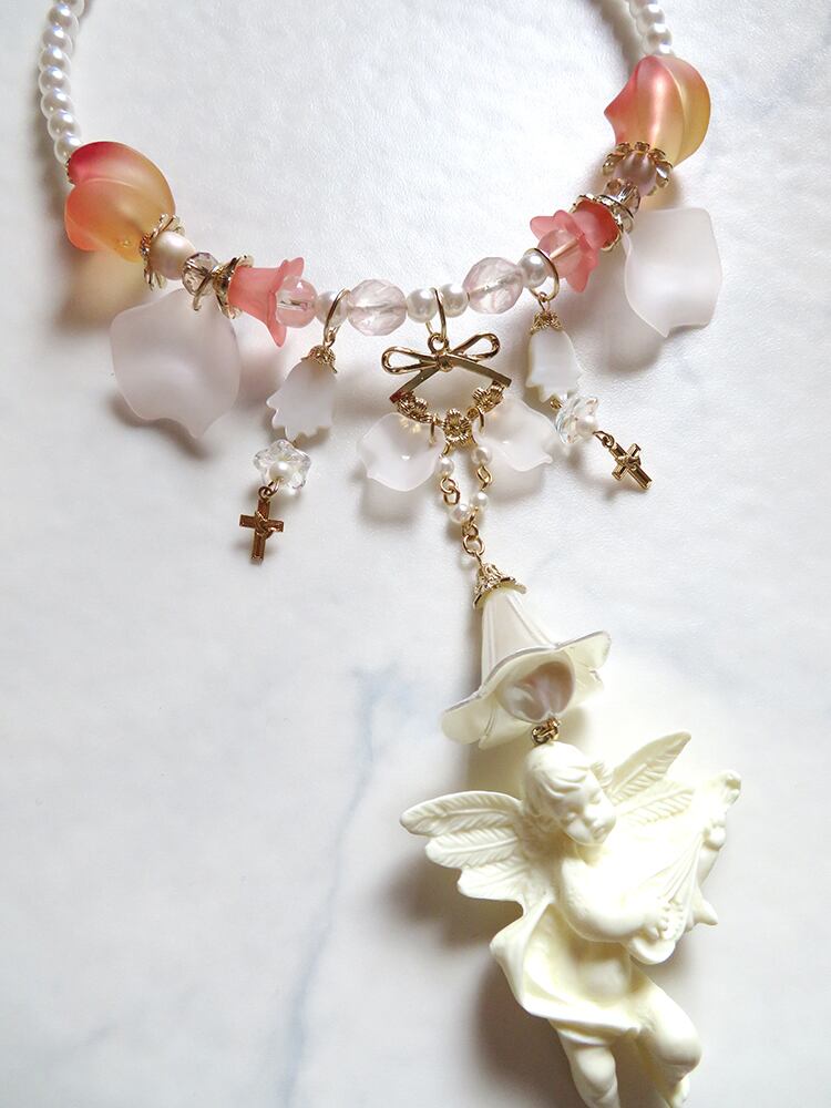 大きな天使チャームがゴージャスなフープネックレス。