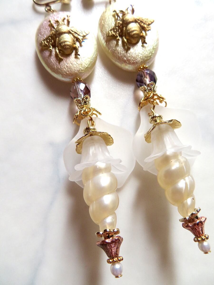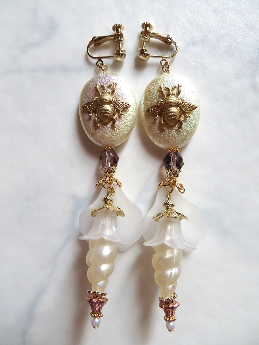 ブラスの蜂は片面のみ。繭のような螺旋状のビーズが美しいデザインです。