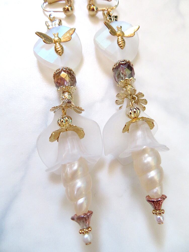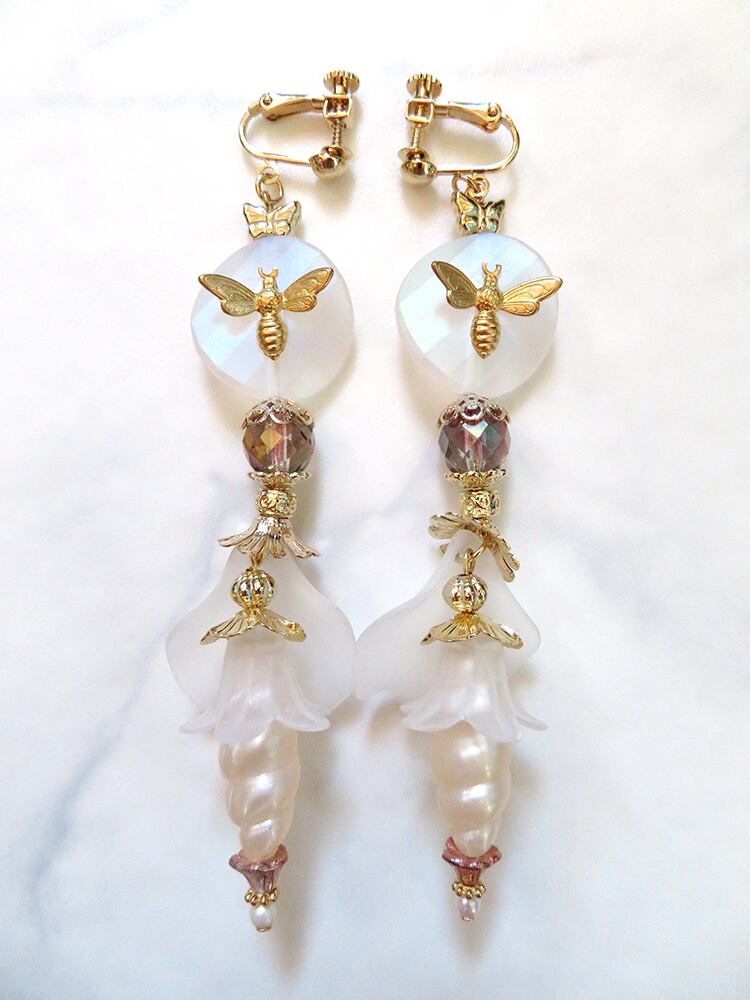 ブラスの蜂は片面のみ。繭のような螺旋状のビーズが美しいデザインです。