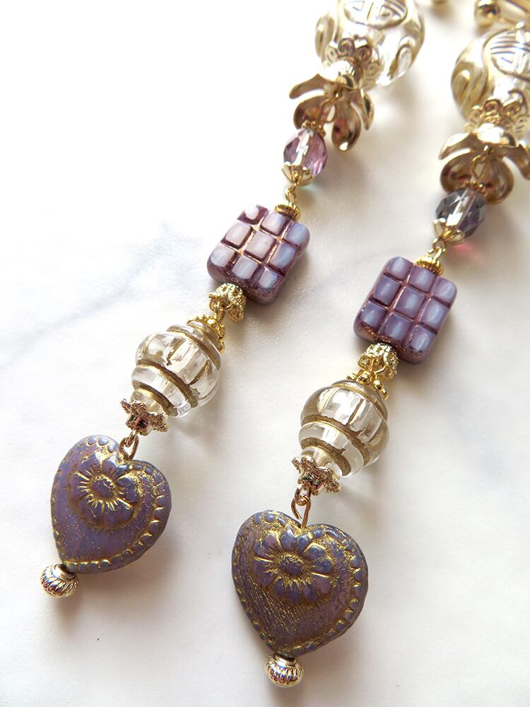 中国趣味を感じるクリアなビーズに、海色のタイルの様なチェコ硝子ビーズ等がゆらゆら揺れるデザインです。