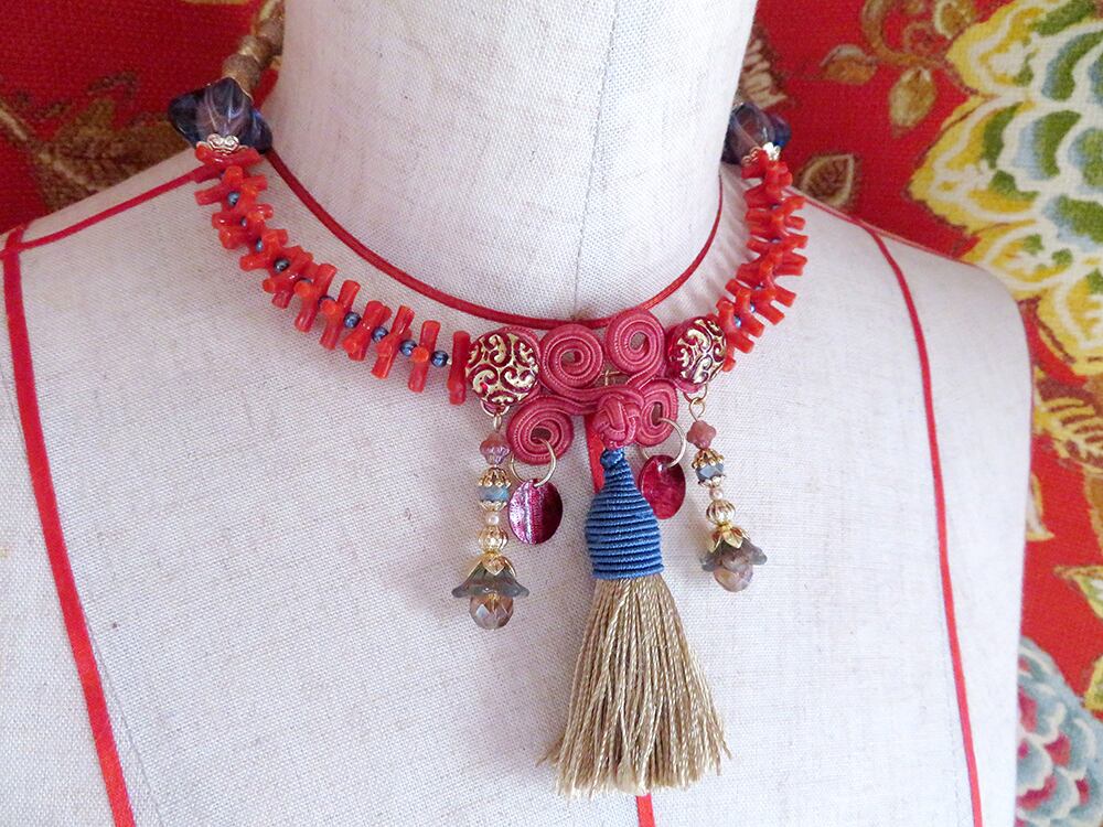 チャイナボタンやフェイク珊瑚等をつなぎ合わせて、360度どこから見ても違った可愛さが出る様に制作しました。