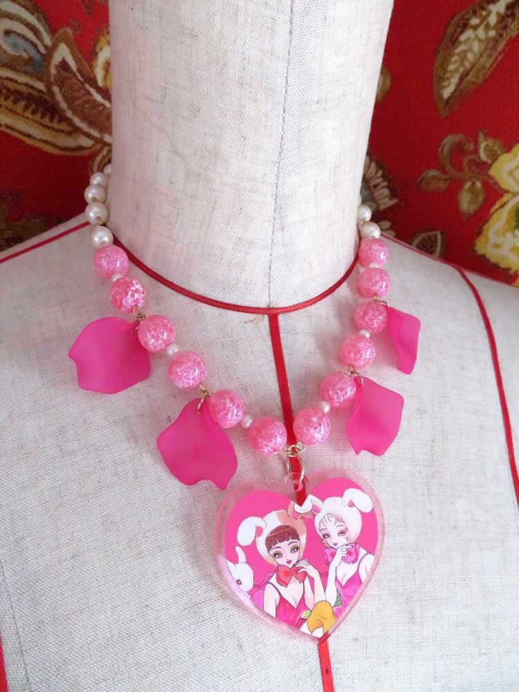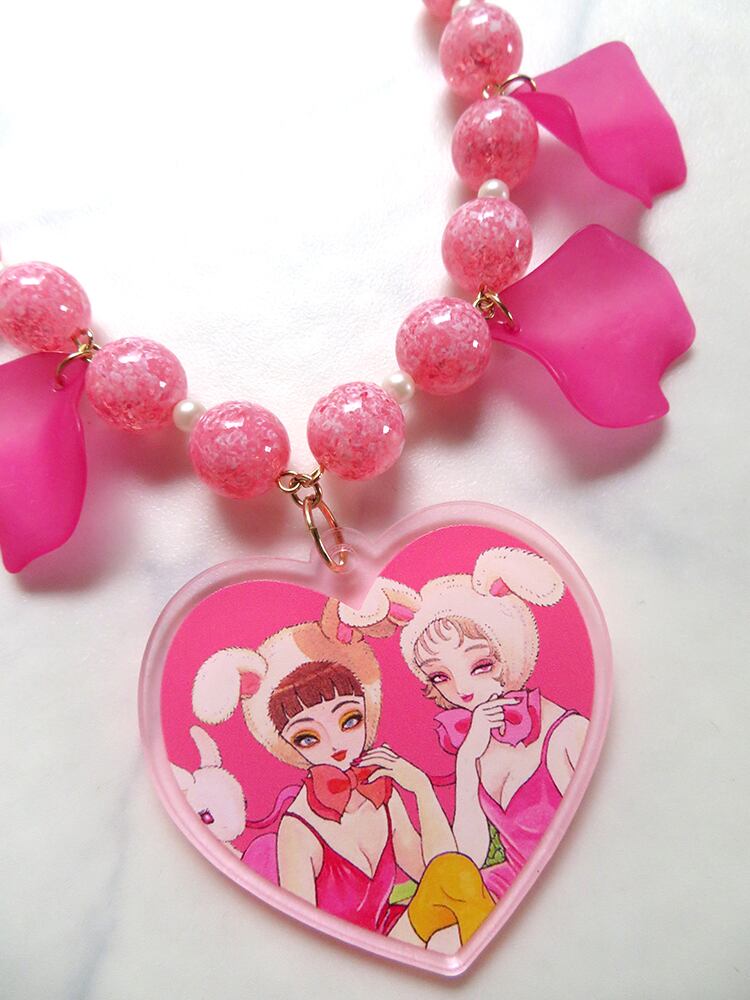 ピンクのローズウォーターを飲みながら仲良し2人でピクニックをするネックレス。