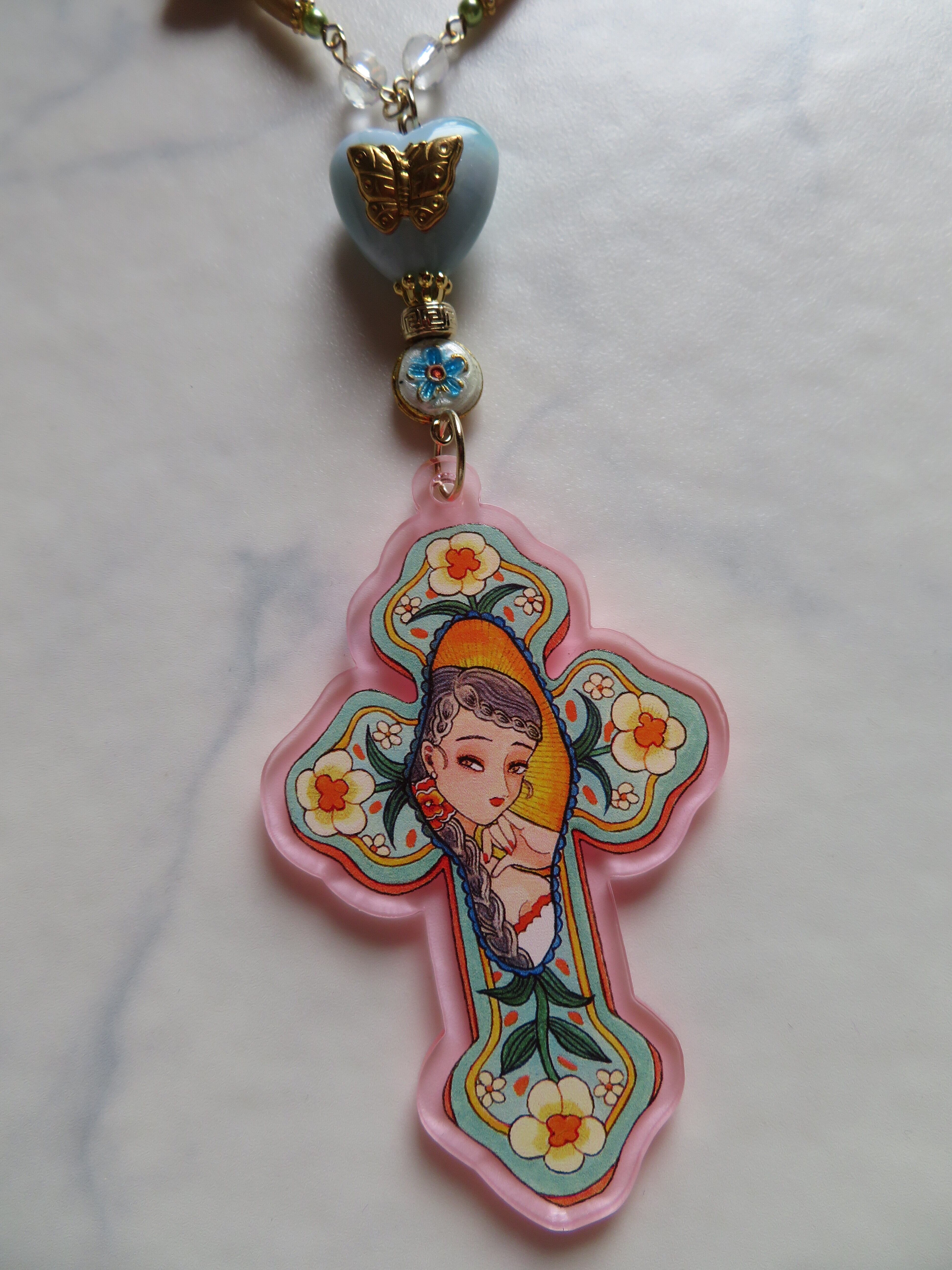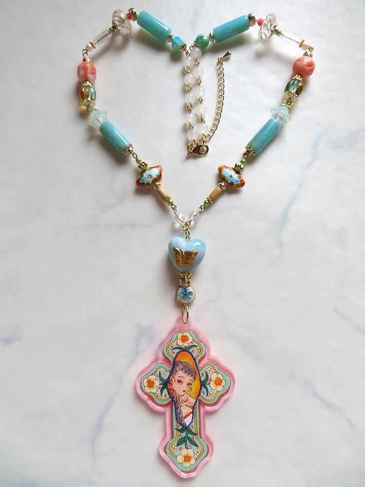 水色とコーラルをベースにしたシノワズリなデザインのロザリオ。