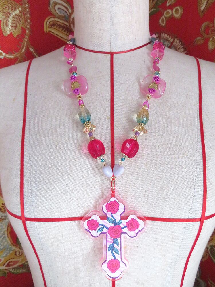 クロスに合わせて360度可愛い様に、ひとつひとつビーズを組み合わせて制作しました。