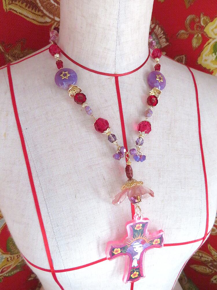 山葡萄の様なカラーで纏めたロザリオネックレス。秋の空気にぴったりな印象のデザインです。