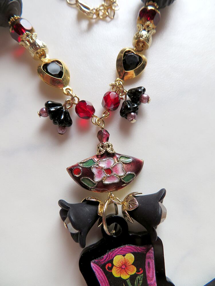 黒地にカラフルなラインストーンが埋め込まれた、少し変わったヴィンテージビーズなどを使用し、黒赤という定番のカラーリングですが他とは違う雰囲気を受けるデザインに纏めました。