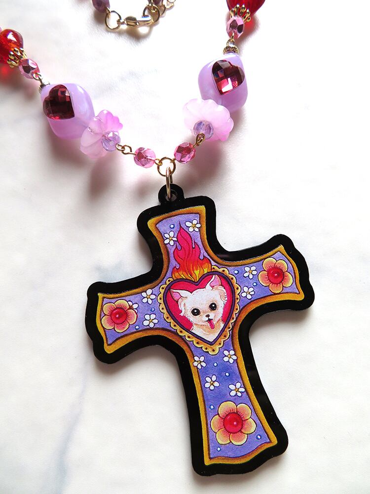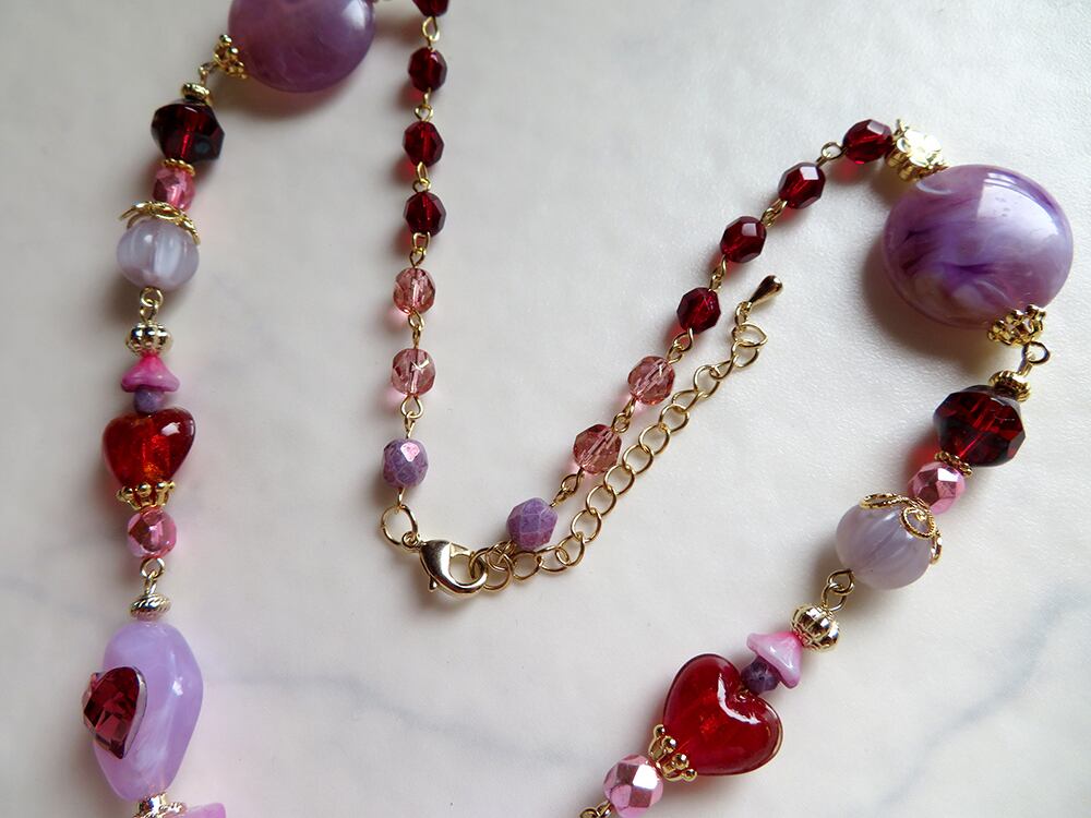 ハートのラインストーンや赤、ピンク、紫で組み合わせた、夏祭りの屋台で売っていたキッチュなアクセサリーをイメージして制作しました。