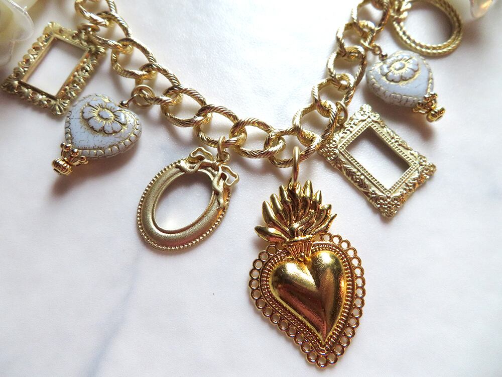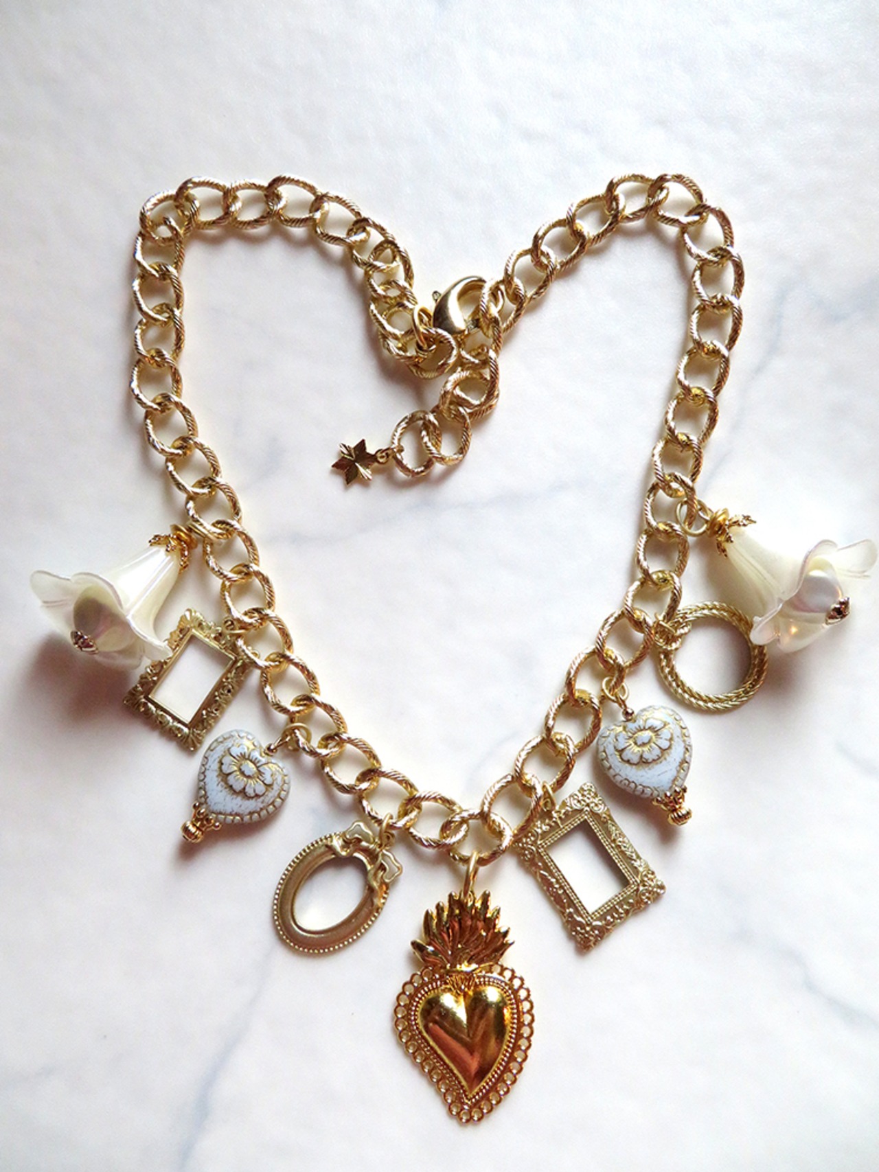 モチーフチャームが沢山ついており、着用するだけでコーディネートのポイントになるデザインです。