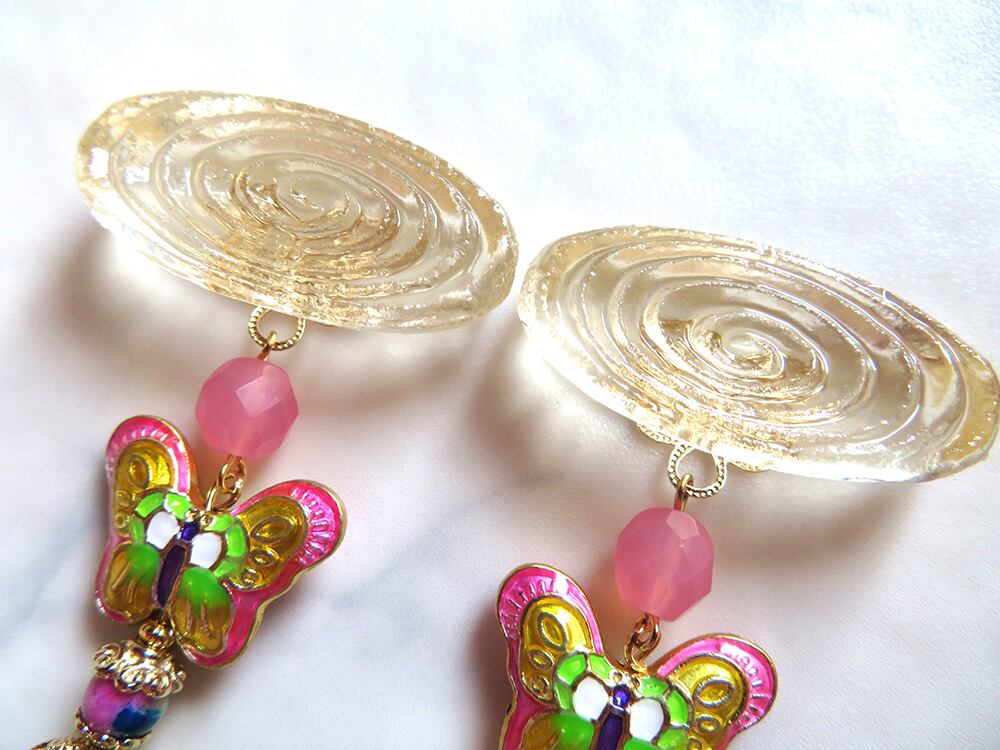 実際は上部の寒天のような流水のパーツの裏に丸いイヤリングorピアスの金具がつきます。