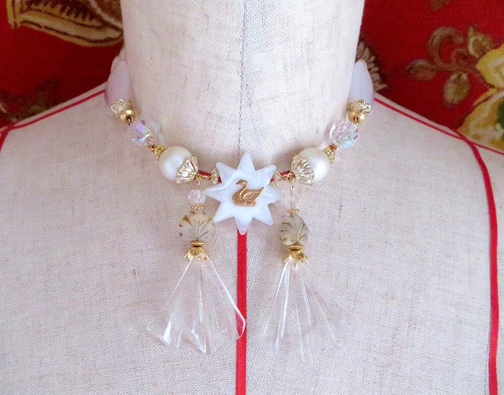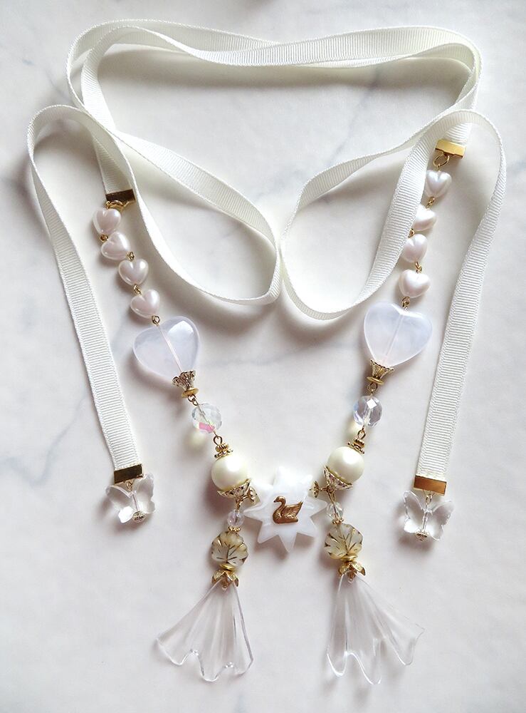 りぼんで長さを調節できるので、チョーカーの様に首にフィットさせたり、緩く結んでネックレスの様に着ける事もできます。
