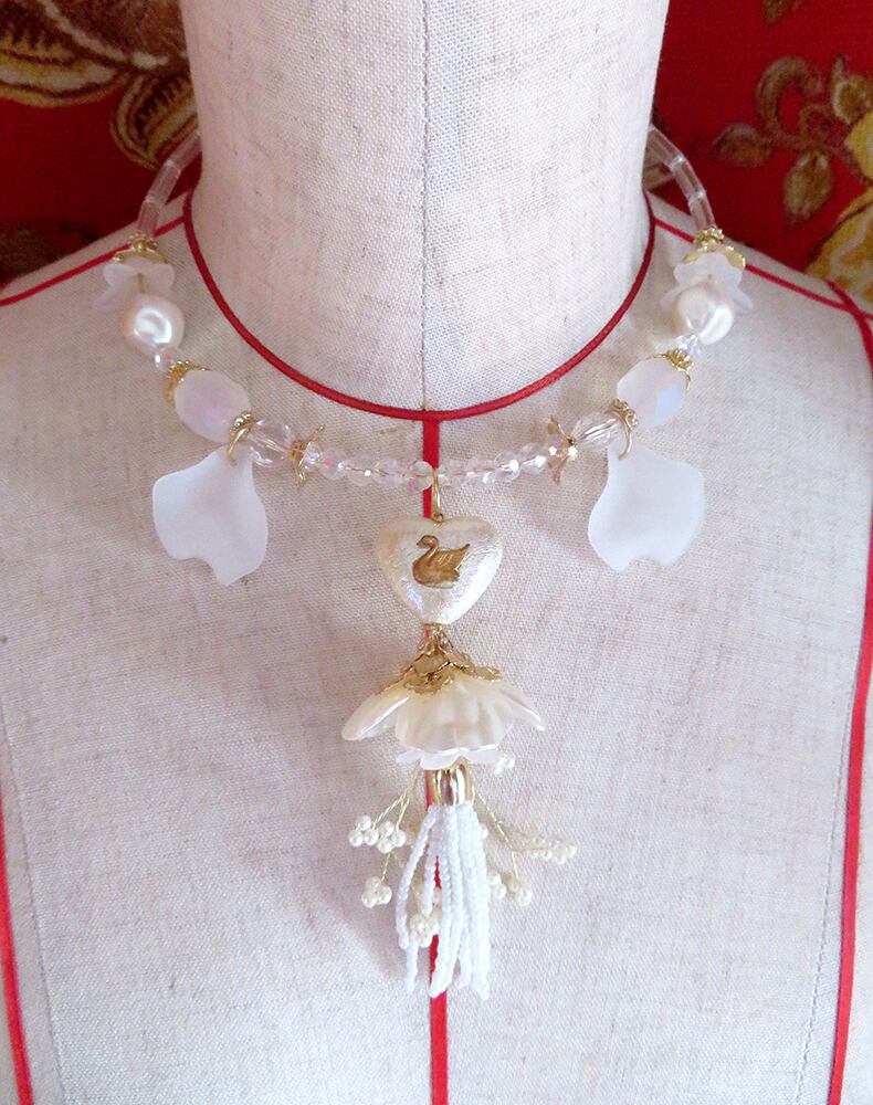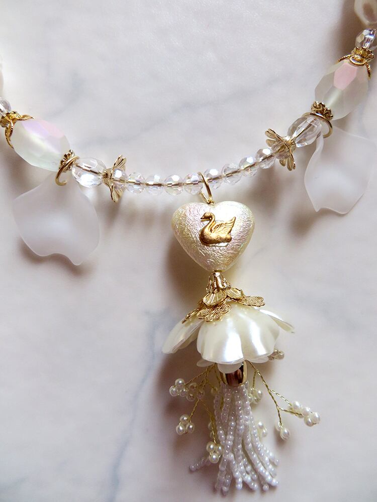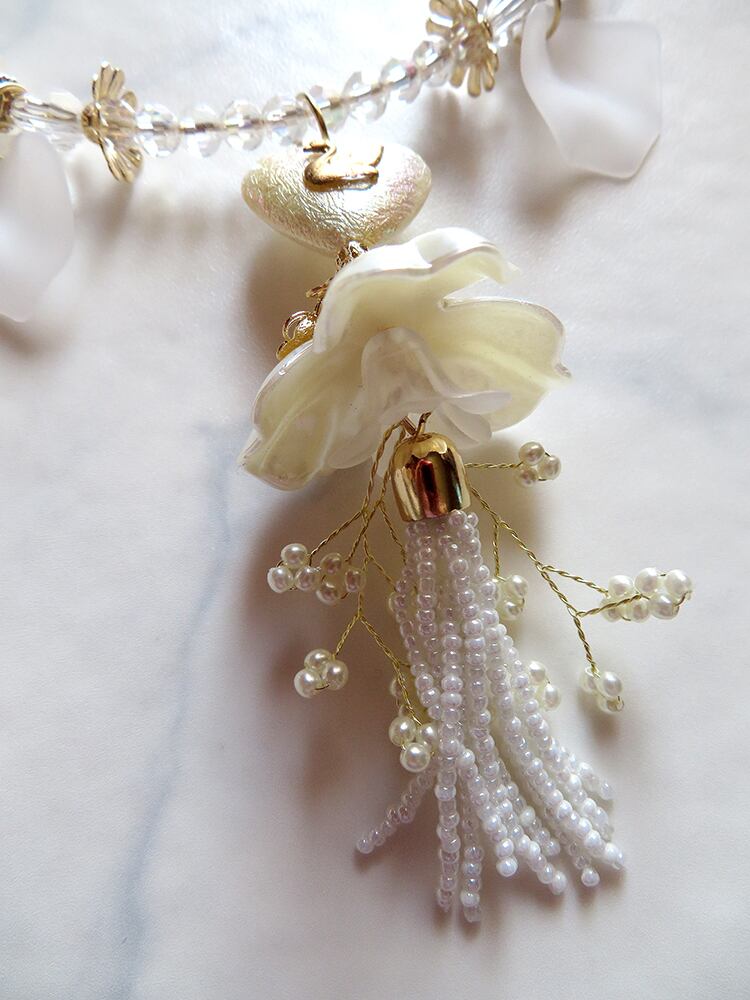 ワイヤーワークの花枝が幻想的で、胸元を軽やかに飾り立ててくれるデザインです。