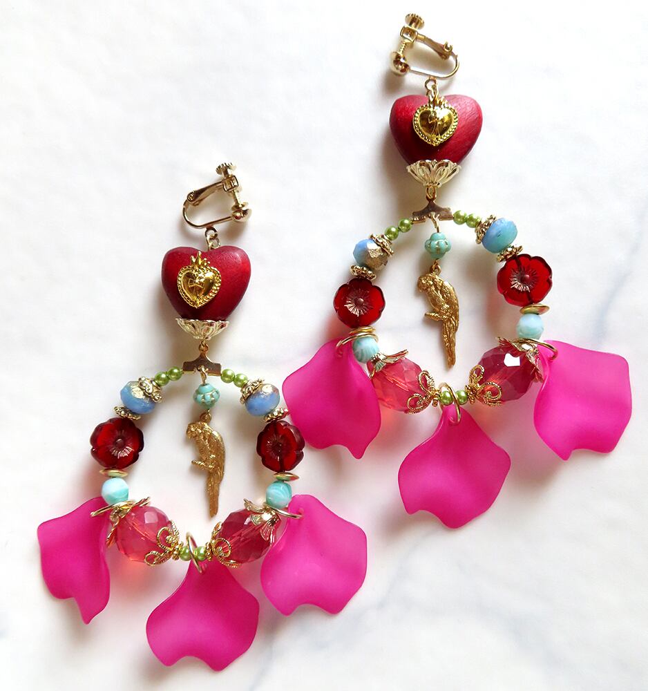 ビーズループに大きな花弁パーツが舞う、おおぶりのデザインです。