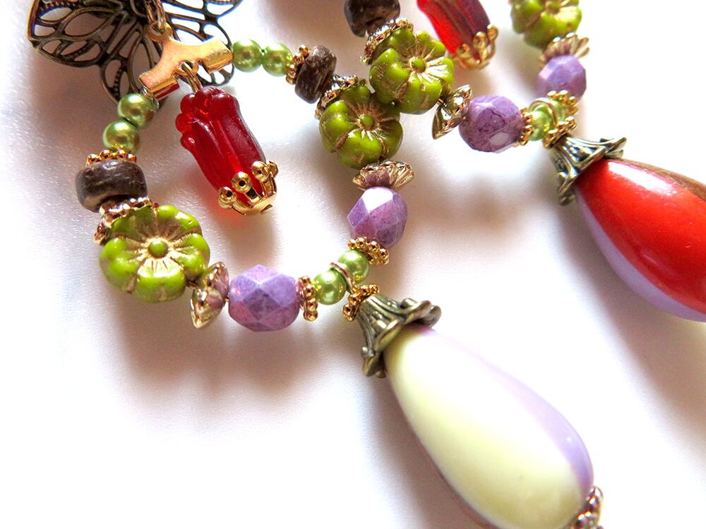 一番下のドロップビーズ は四色で組んであり、出る面で全体の雰囲気も変化してとても可愛いです。