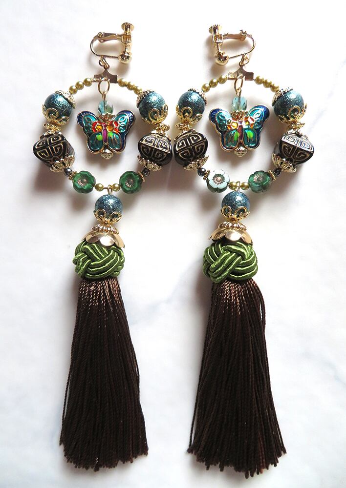 巨人の盤古が使う栞をイメージした大振りのタッセルと、物語をイメージした装飾的なフープが華やかなデザインです。