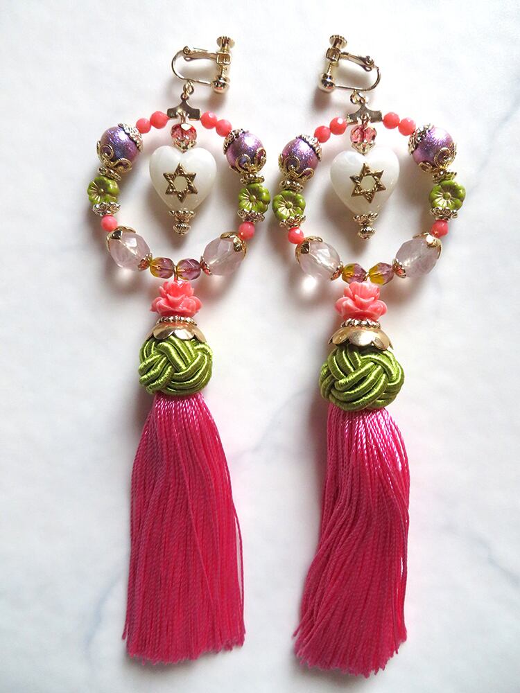 巨人の盤古が使う栞をイメージした大振りのタッセルと、物語をイメージした装飾的なフープが華やかなデザインです。