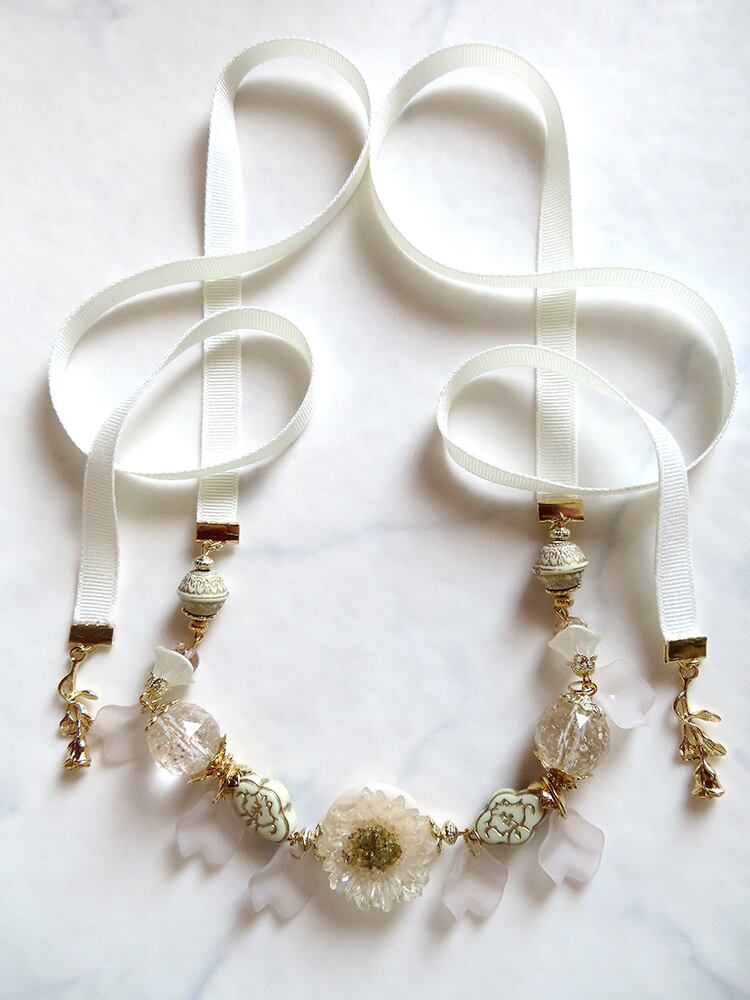 りぼんで長さを調節できるので、チョーカーの様に首にフィットさせたり、緩く結んでネックレスの様に着ける事もできます。