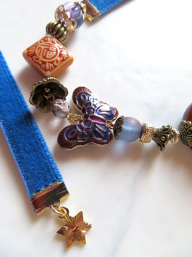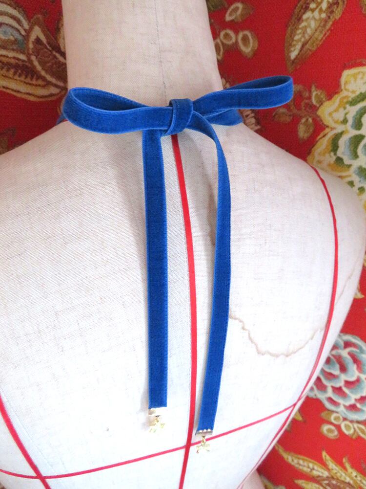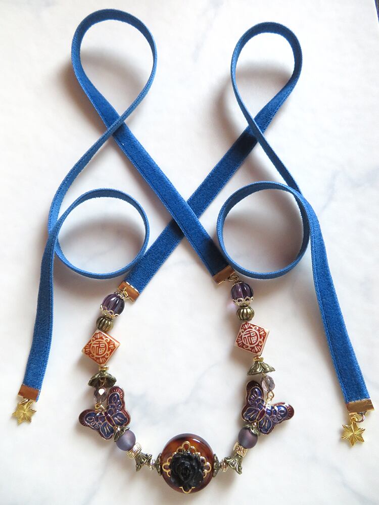 りぼんで長さを調節できるので、チョーカーの様に首にフィットさせたり、緩く結んでネックレスの様に着ける事もできます。