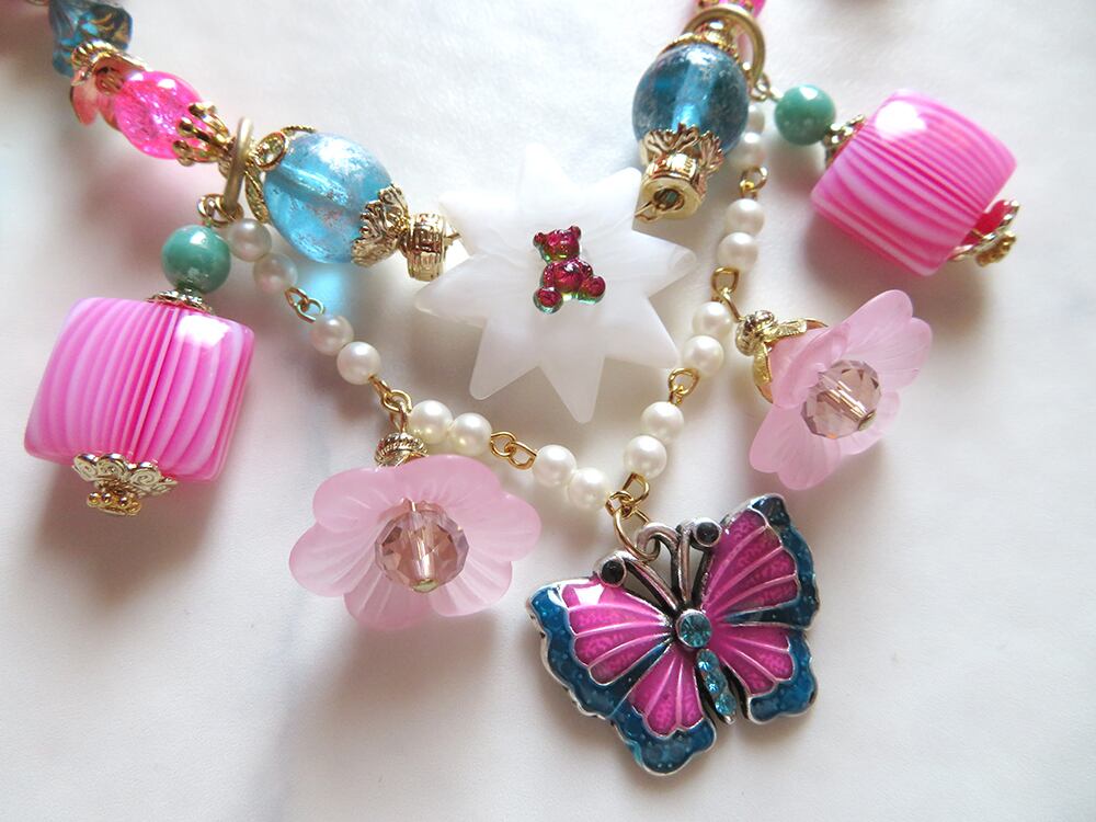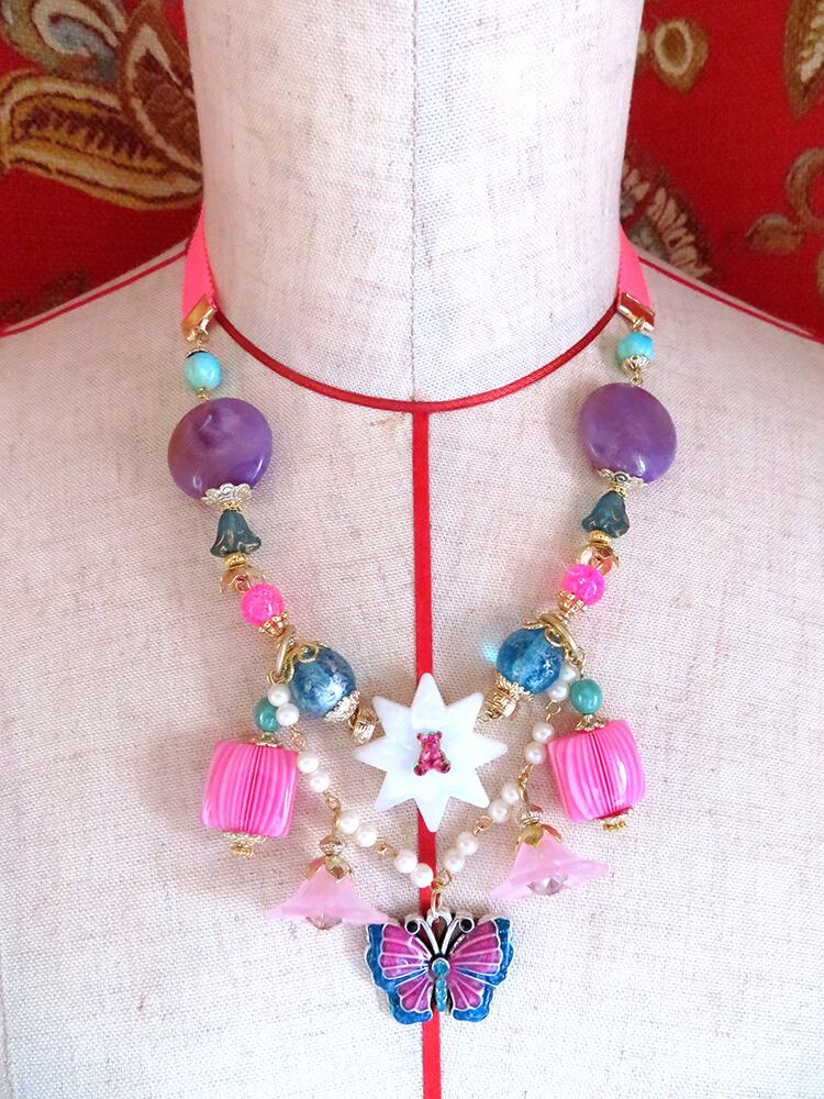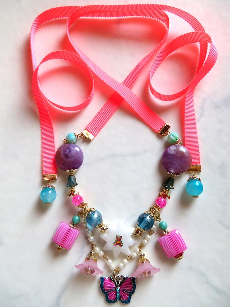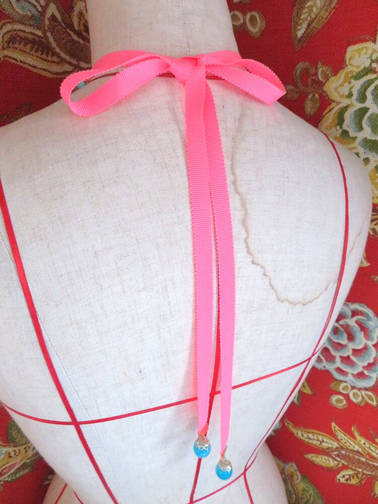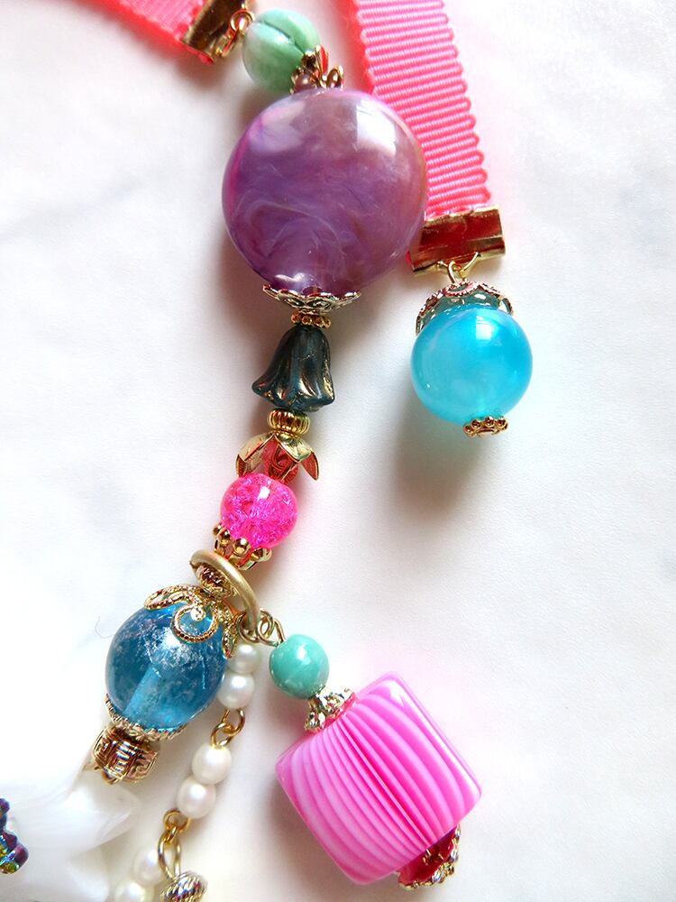 りぼんで長さを調節できるので、チョーカーの様に首にフィットさせたり、緩く結んでネックレスの様に着ける事もできます。