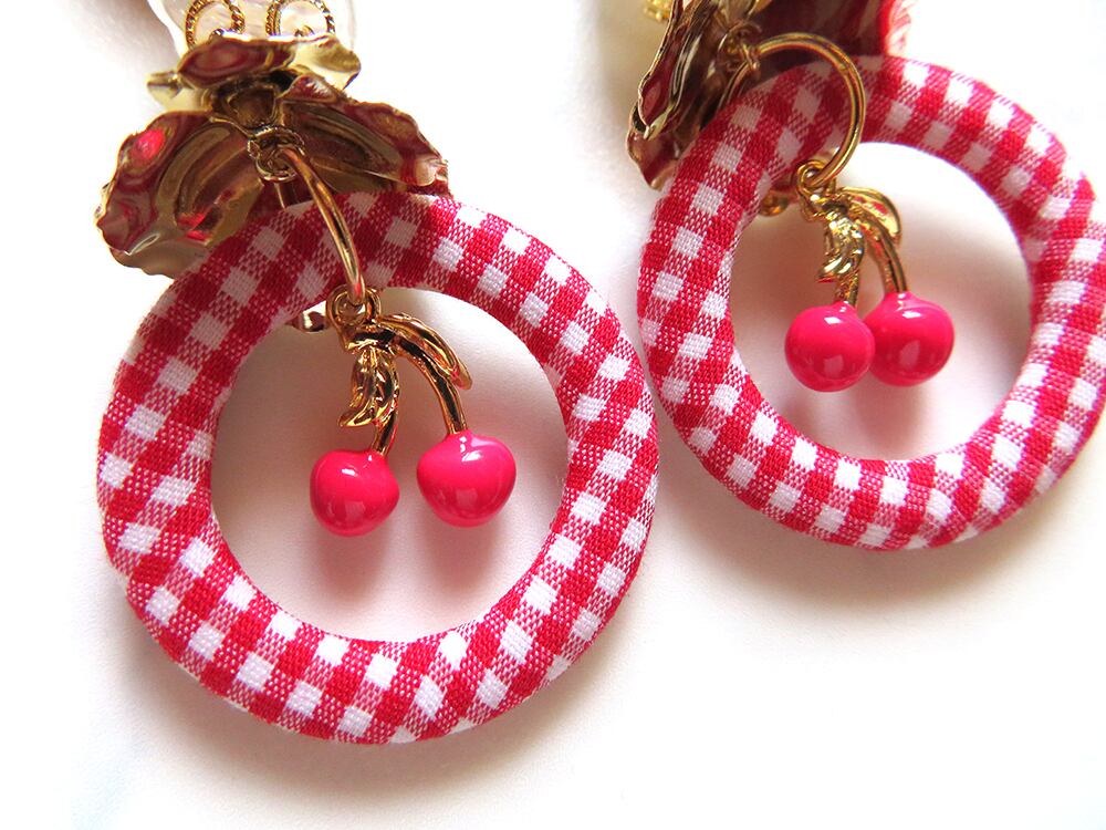 春のピクニックシーズンにぴったりなギンガムチェックとチェリーの耳飾り。