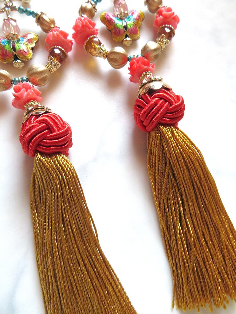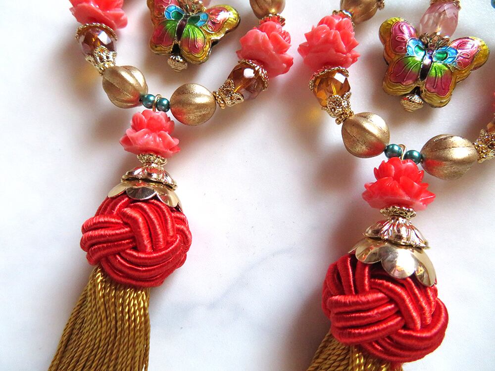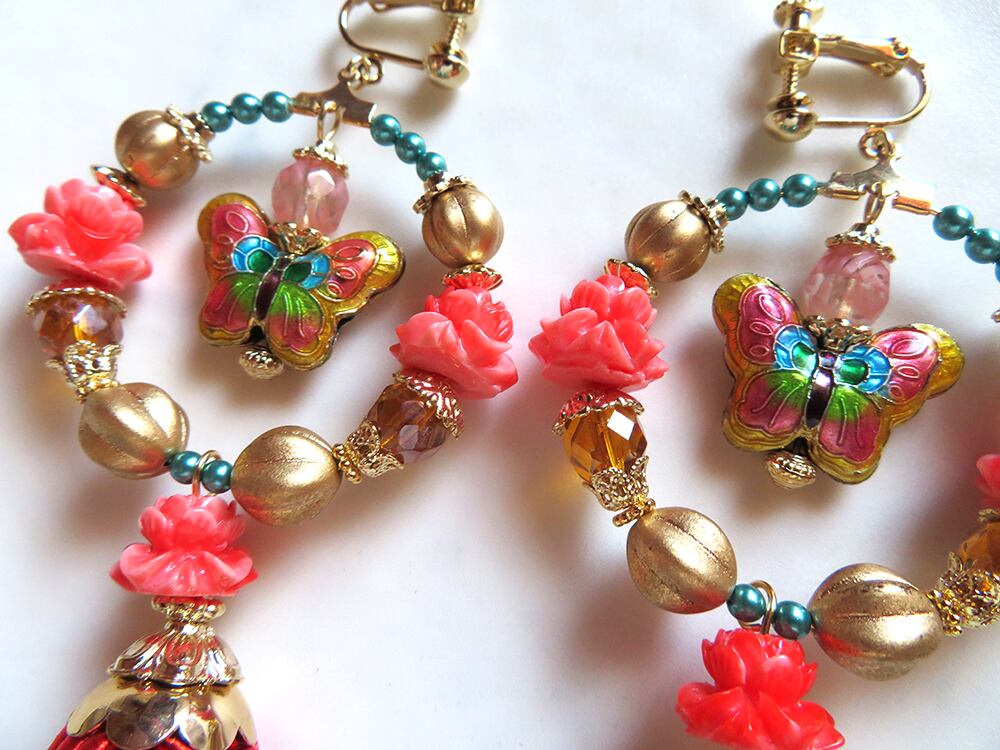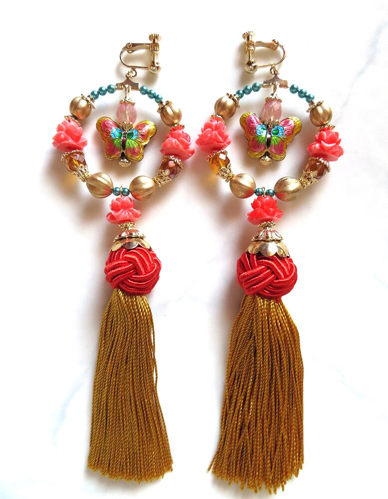 画像ですとタッセルや花ビーズのオレンジの彩度が高めですが、実物はもう少し気持ち落ち着いた印象の色味です。