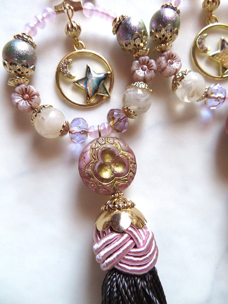 巨人の盤古が使う栞をイメージした大振りのタッセルと、物語をイメージした装飾的なフープが華やかなデザインです。