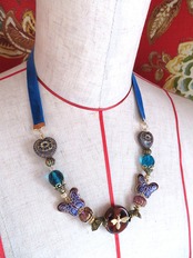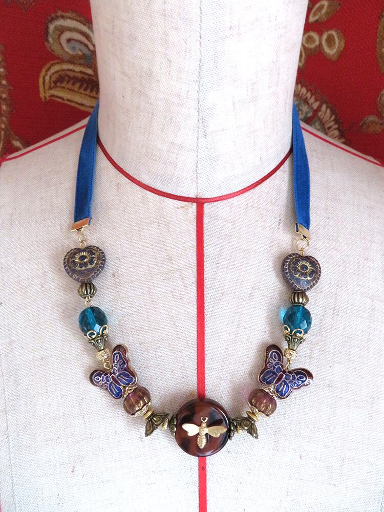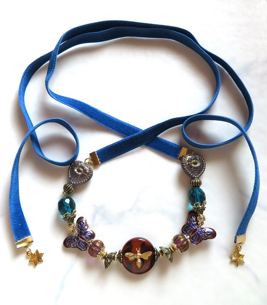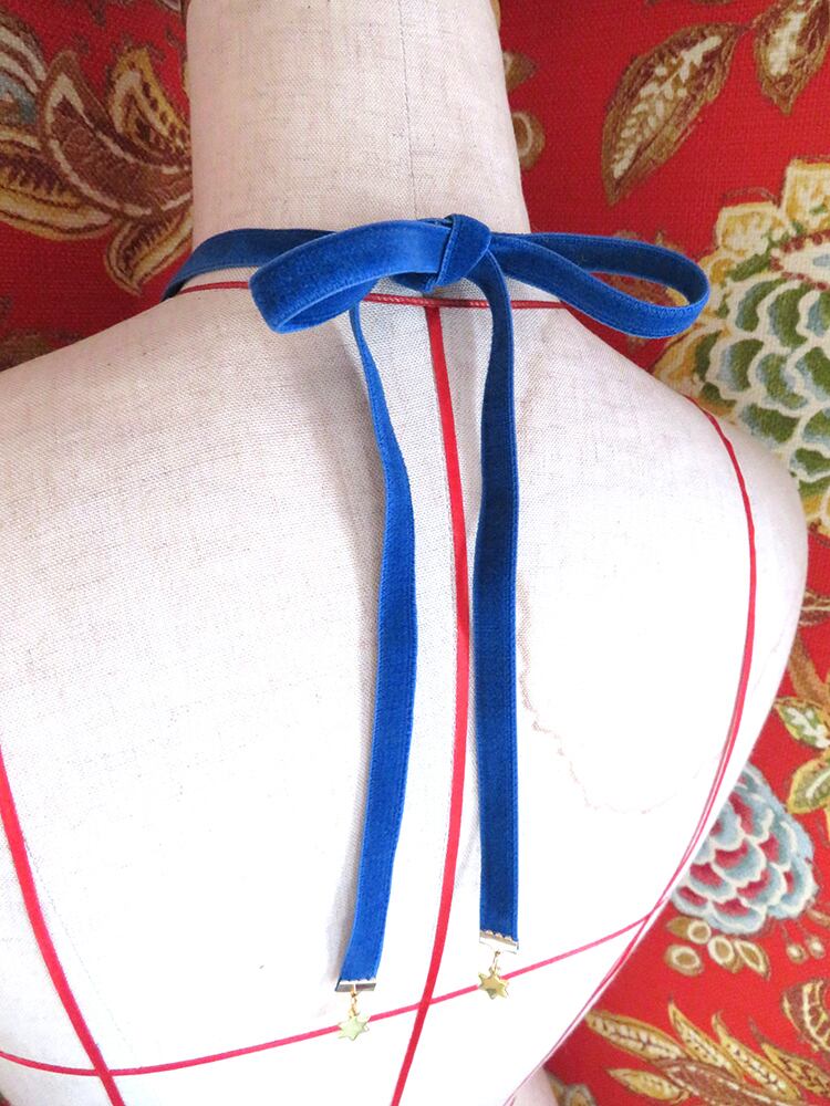 りぼんで長さを調節できるので、チョーカーの様に首にフィットさせたり、緩く結んでネックレスの様に着ける事もできます。