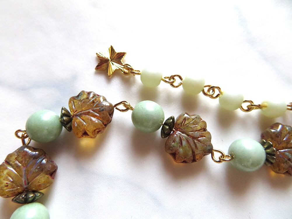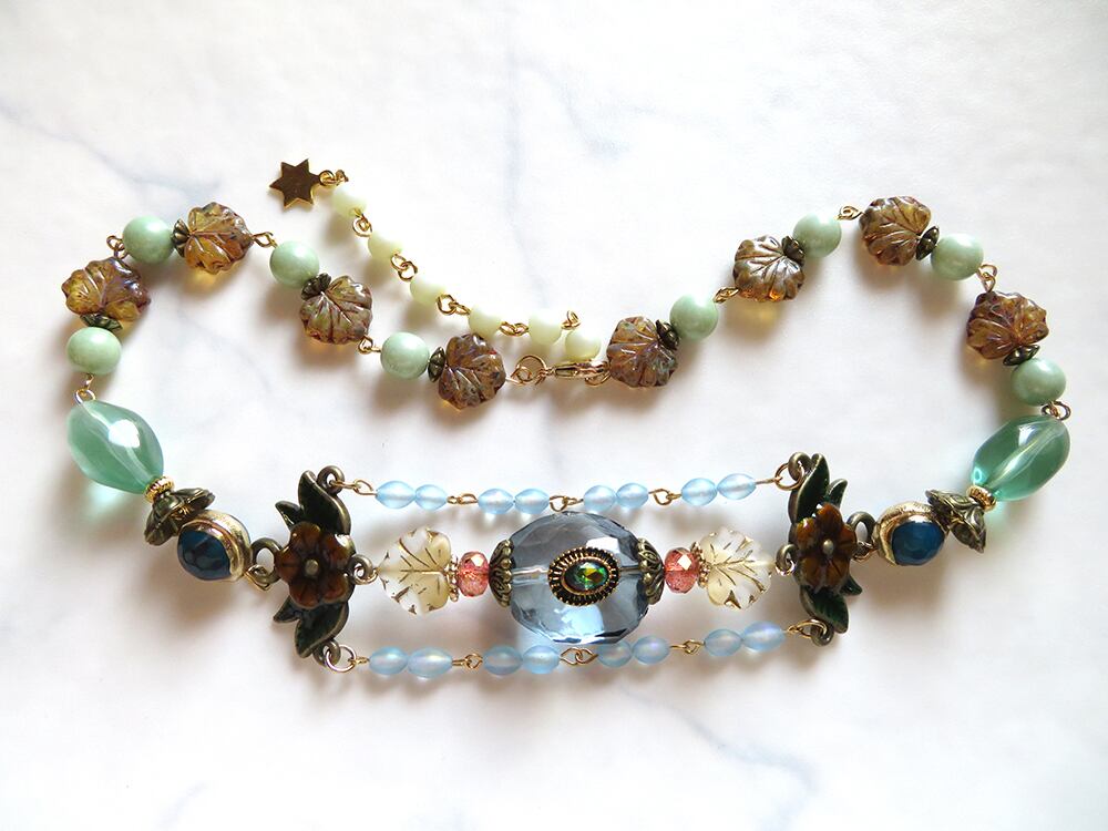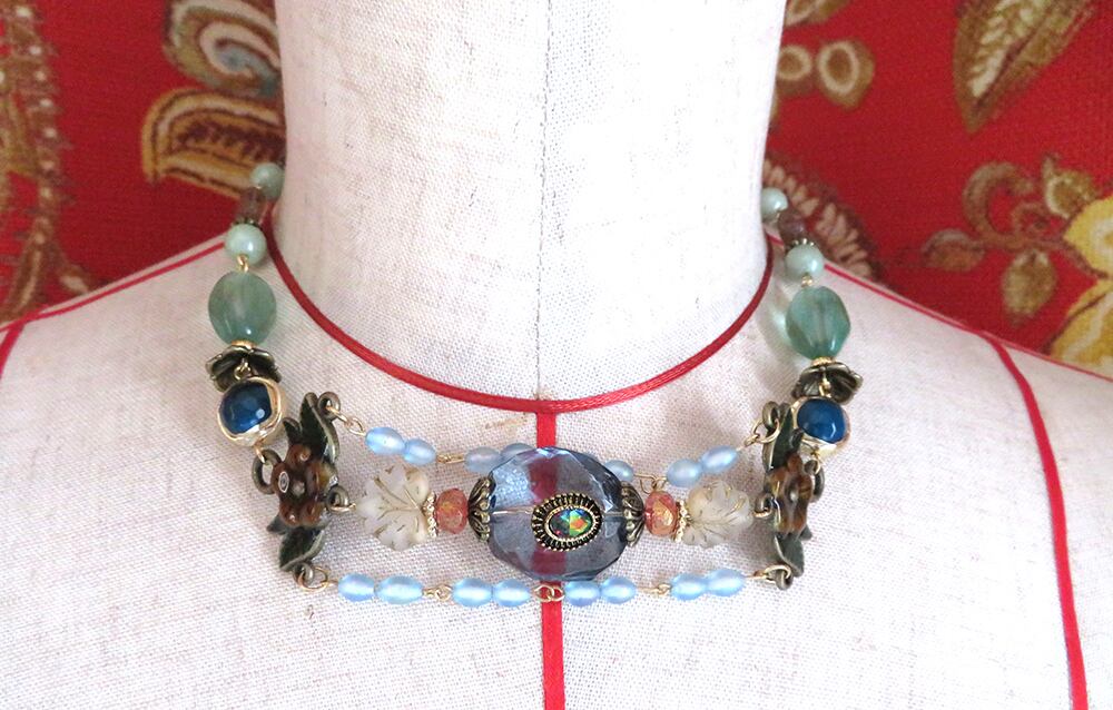 襟ぐりが深めのタートルなどにも合わせられる様に、センターモチーフの上部のビーズを少し弛ませて作ってあります。