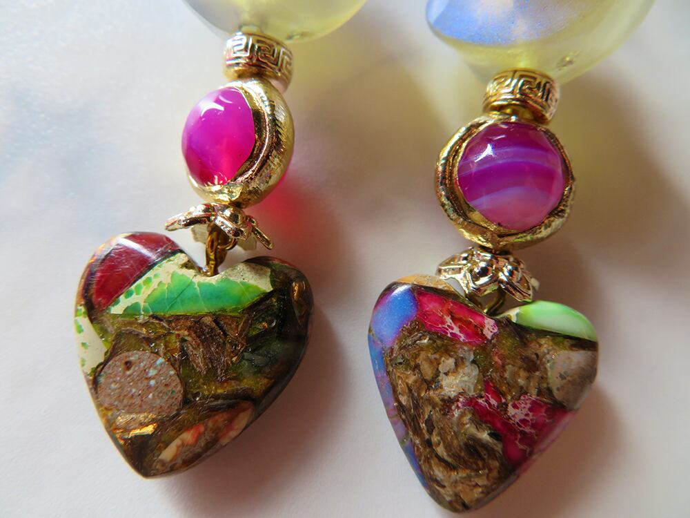 天然石や不思議な光り方をするアクリルビーズ、様々な硝子ビーズなどを使用しこの世には存在しない架空の宝石たちをデザインしました。