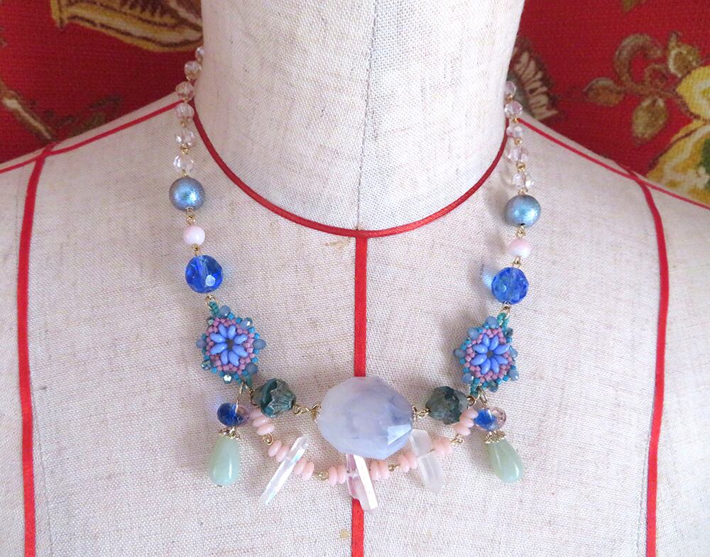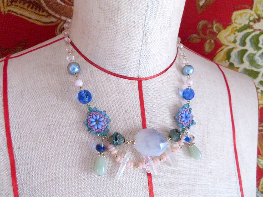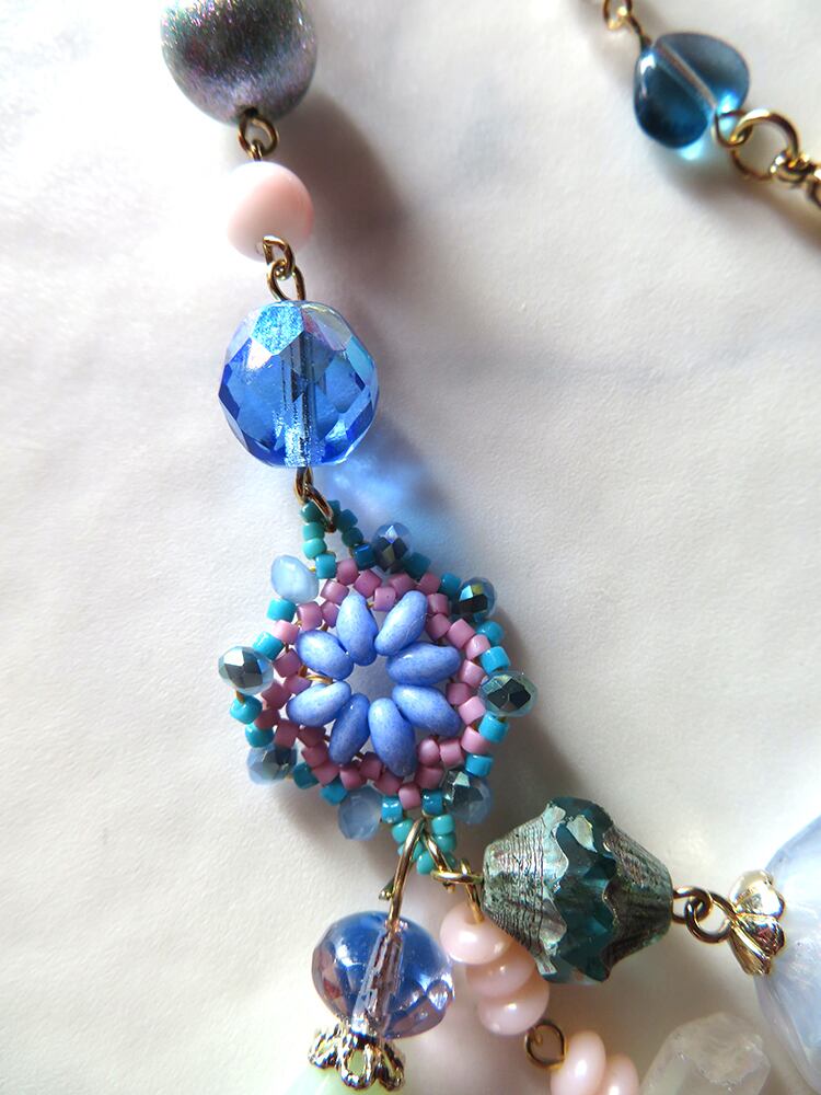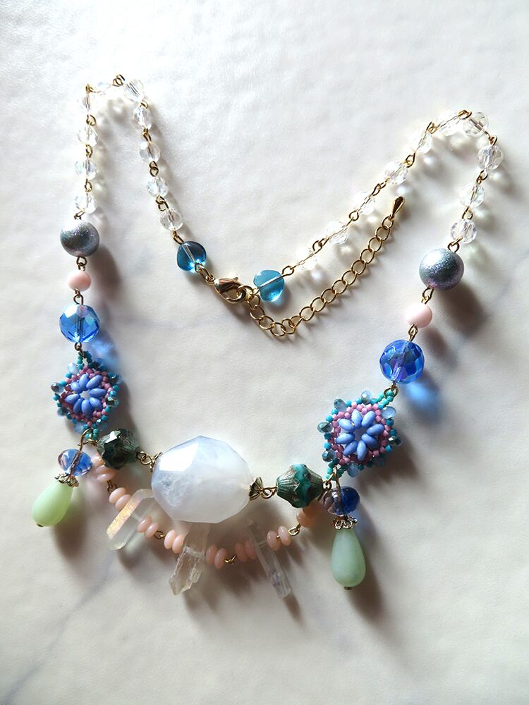 天然石や不思議な光り方をするアクリルビーズ、様々な硝子ビーズなどを使用しこの世には存在しない架空の宝石たちをデザインしました。