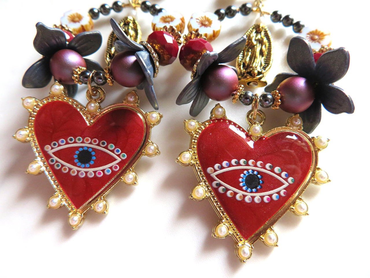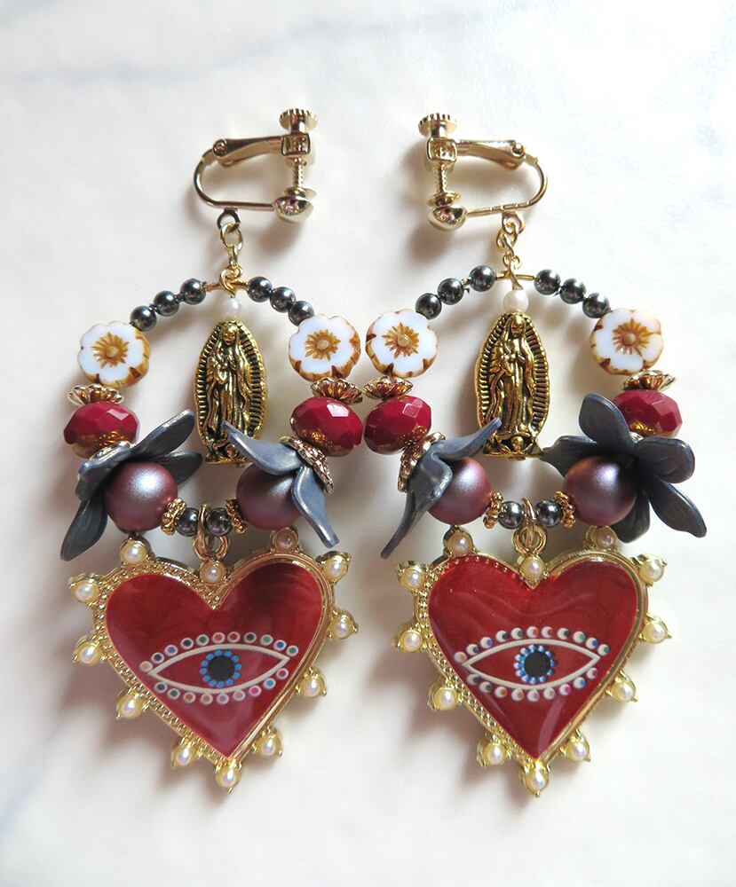 朱いオニユリの小箱に入った、赤い大聖堂の内装をイメージした耳飾り。
