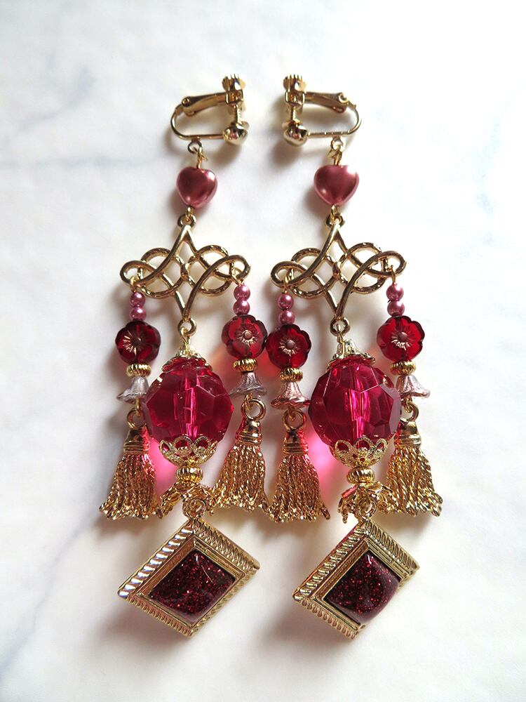 朱いオニユリの小箱に入った、ナイトパーティーの記憶をイメージした耳飾り。