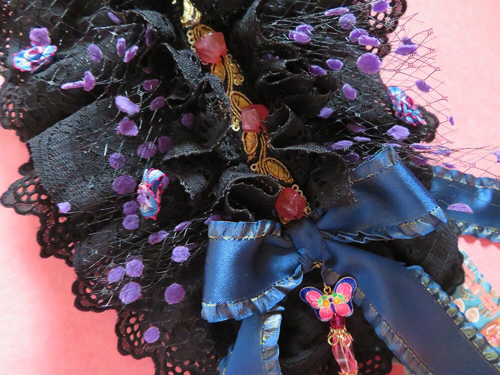 以前制作した耳飾りとお揃いの蝶々のチャームがリボン下についています。