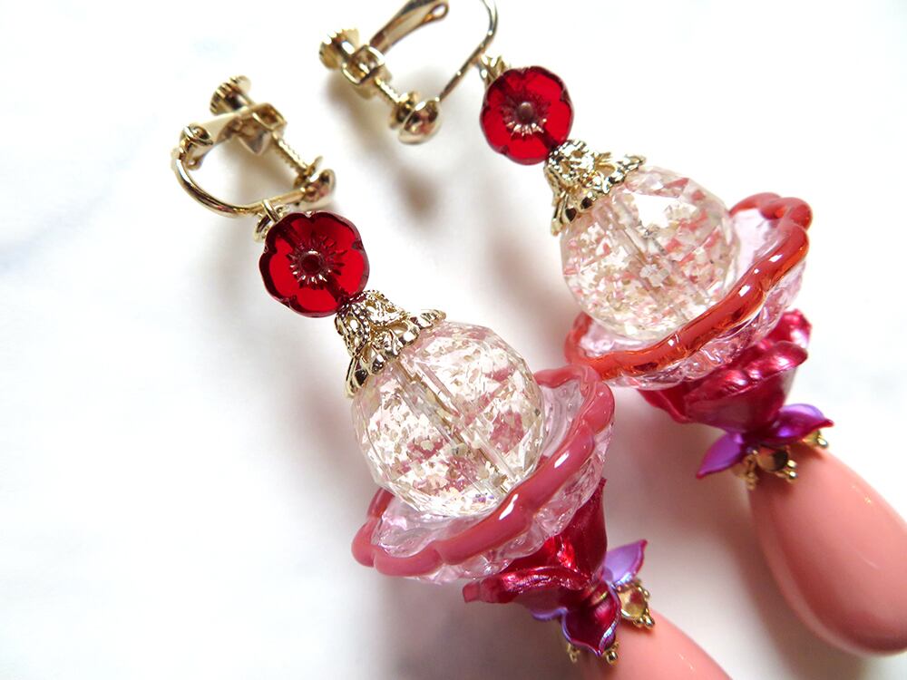 カラフルなアクリルやプラビーズを多用していますが、チープにならない様に差し色のゴールドやチェコ、アメリカのハンドメイドのガラスビーズ等を使用して、大人の女性が気軽に着けられる遊び心あるディテールに仕上げました。