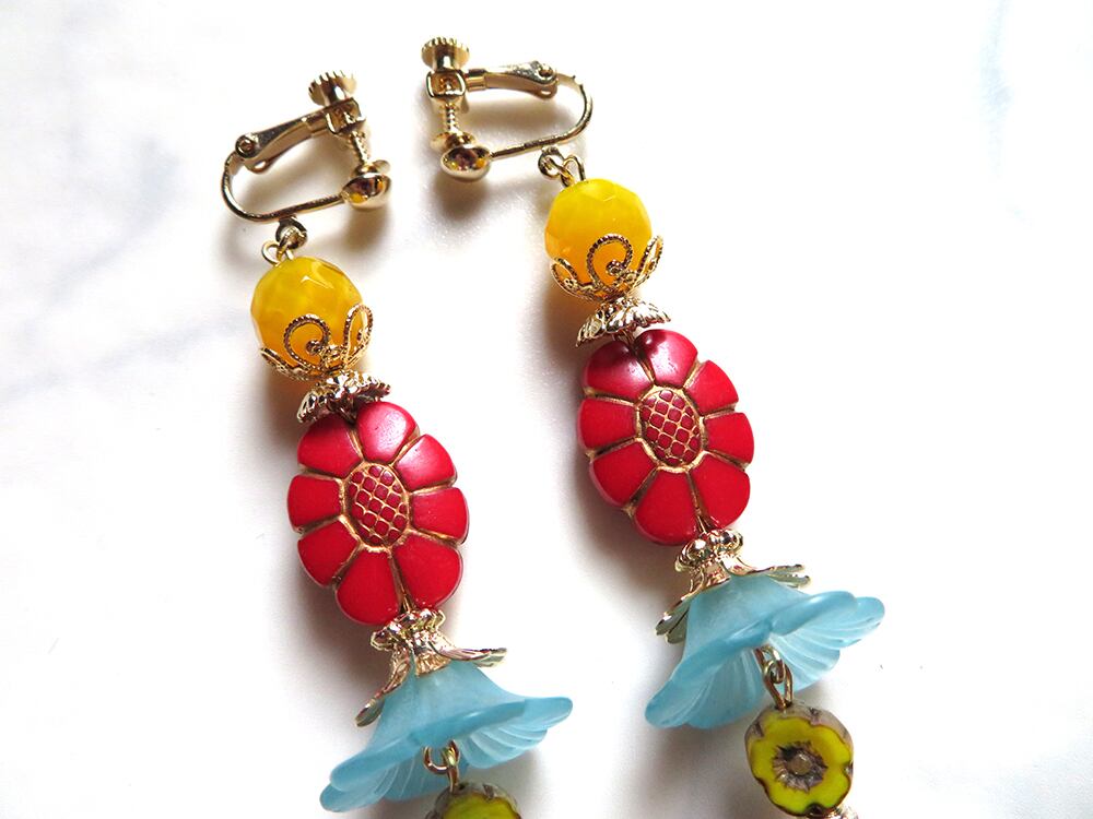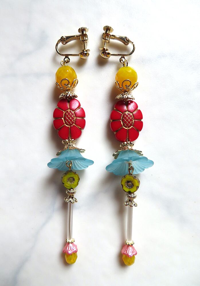 カラフルなアクリルやプラビーズを多用していますが、チープにならない様に差し色のゴールドやチェコ、アメリカのハンドメイドのガラスビーズ等を使用して、大人の女性が気軽に着けられる遊び心あるディテールに仕上げました。