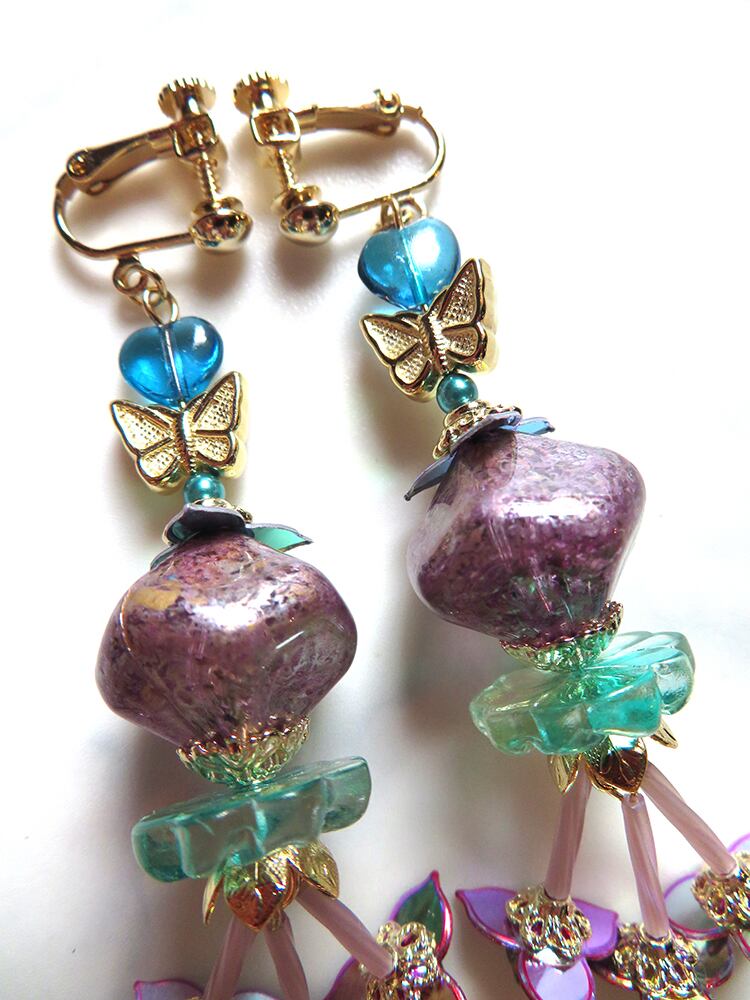 カラフルなアクリルやプラビーズを多用していますが、チープにならない様に差し色のゴールドやチェコ、アメリカのハンドメイドのガラスビーズ等を使用して、大人の女性が気軽に着けられる遊び心あるディテールに仕上げました。