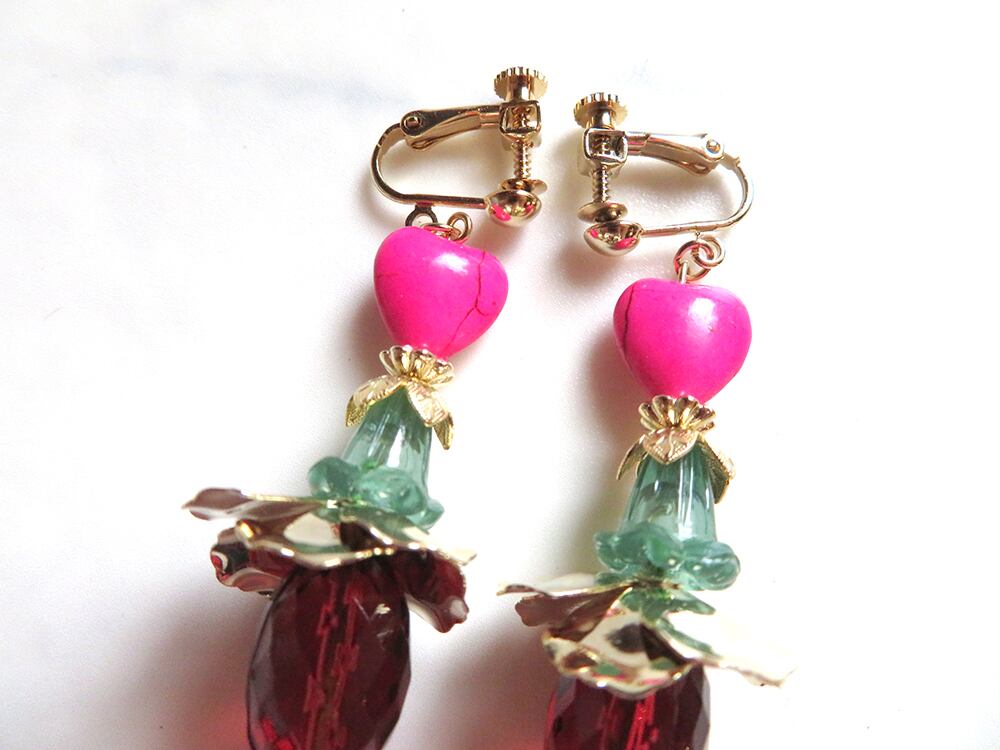カラフルなアクリルやプラビーズを多用していますが、チープにならない様に差し色のゴールドやチェコ、アメリカのハンドメイドのガラスビーズ等を使用して、大人の女性が気軽に着けられる遊び心あるディテールに仕上げました。