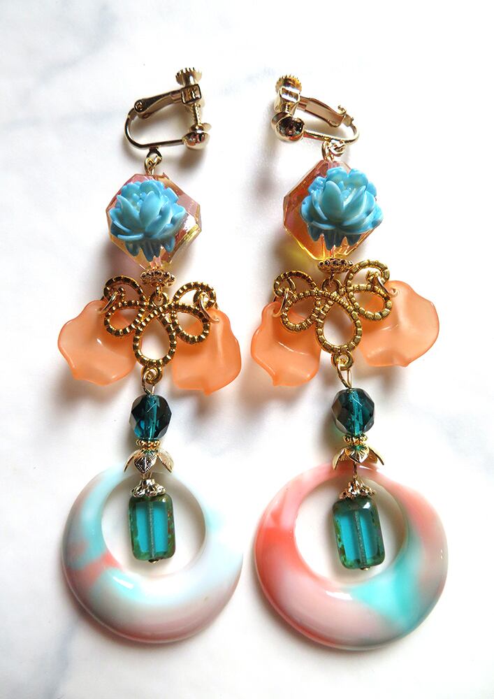 カラフルなアクリルやプラビーズを多用していますが、チープにならない様に差し色のゴールドやチェコ、アメリカのハンドメイドのガラスビーズ等を使用して、大人の女性が気軽に着けられる遊び心あるディテールに仕上げました。