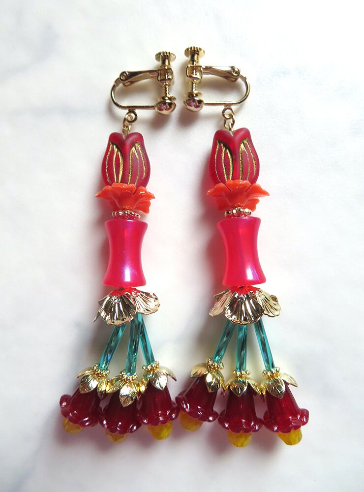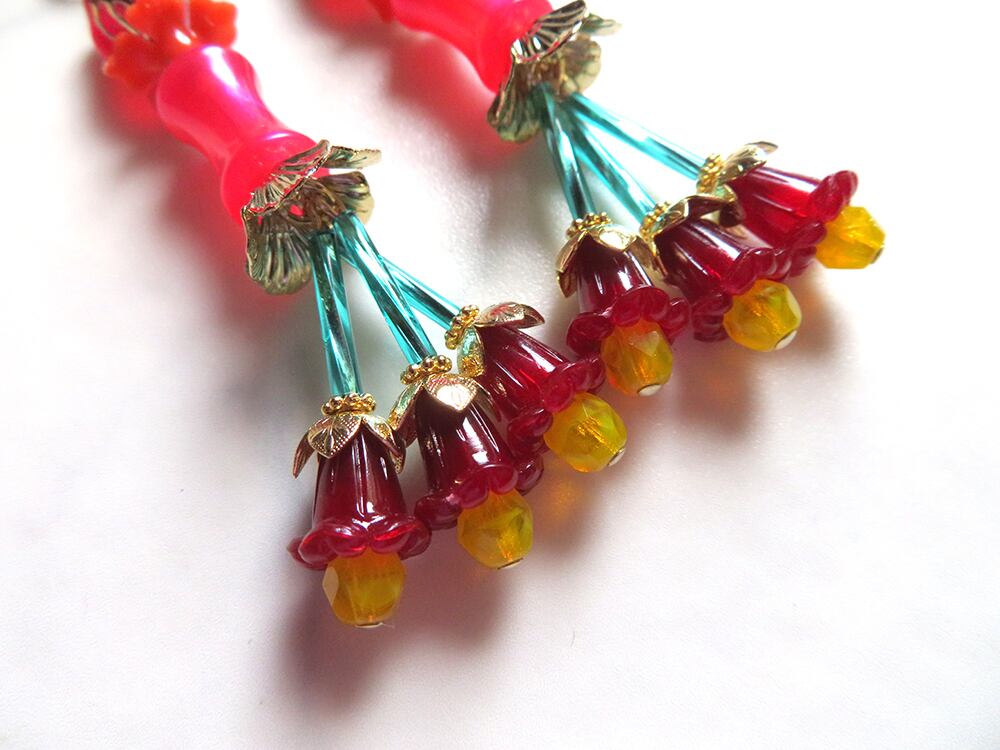 カラフルなアクリルやプラビーズを多用していますが、チープにならない様に差し色のゴールドやチェコ、アメリカのハンドメイドのガラスビーズ等を使用して、大人の女性が気軽に着けられる遊び心あるディテールに仕上げました。