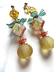 カラフルなアクリルやプラビーズを多用していますが、チープにならない様に差し色のゴールドやチェコ、アメリカのハンドメイドのガラスビーズ等を使用して、大人の女性が気軽に着けられる遊び心あるディテールに仕上げました。