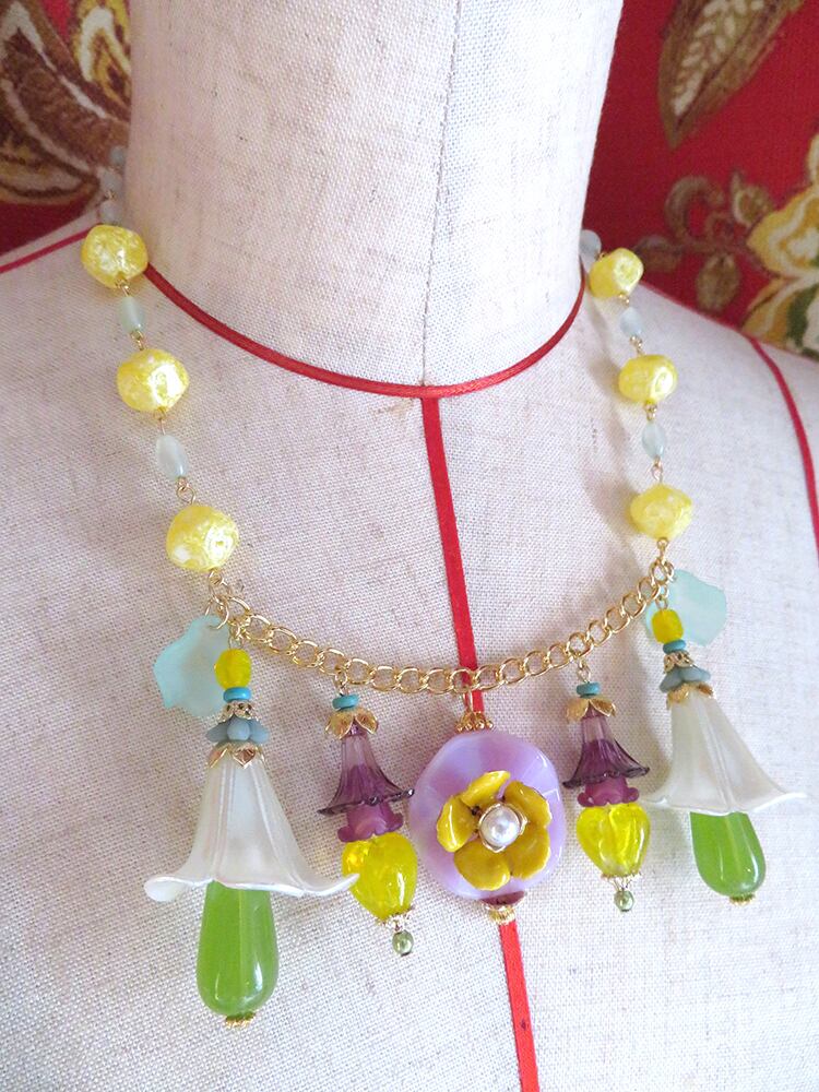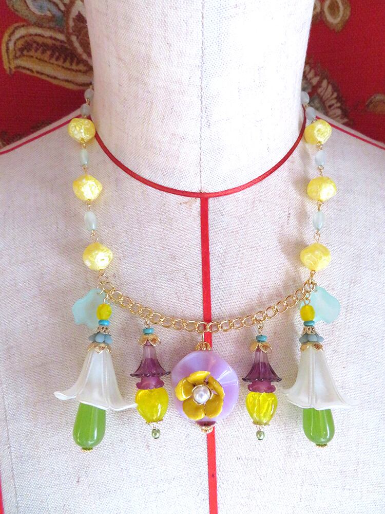カラフルなアクリルやプラビーズを多用していますが、チープにならない様に差し色のゴールドやチェコ、アメリカのハンドメイドのガラスビーズ等を使用して、大人の女性が気軽に着けられる遊び心あるディテールに仕上げました。