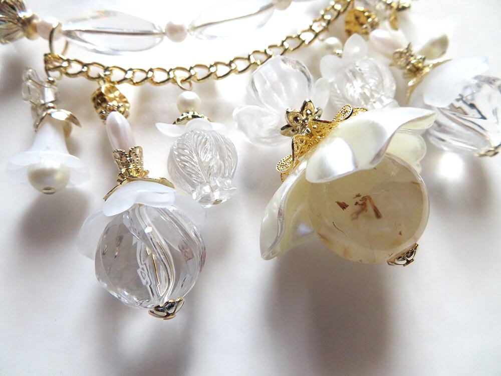 クリアやフロストが美しいドイツビーズをメインに、アクリル、プラ、チェコ硝子、ヴィンテージビーズ等をふんだんに使用し、夏の気分を薄荷水の様に爽やかに盛り上げてくれるクリアデザインを制作しました。
