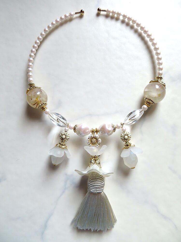クリアやフロストが美しいドイツビーズをメインに、アクリル、プラ、チェコ硝子、ヴィンテージビーズ等をふんだんに使用し、夏の気分を薄荷水の様に爽やかに盛り上げてくれるクリアデザインを制作しました。