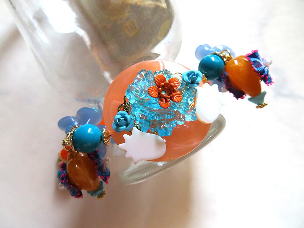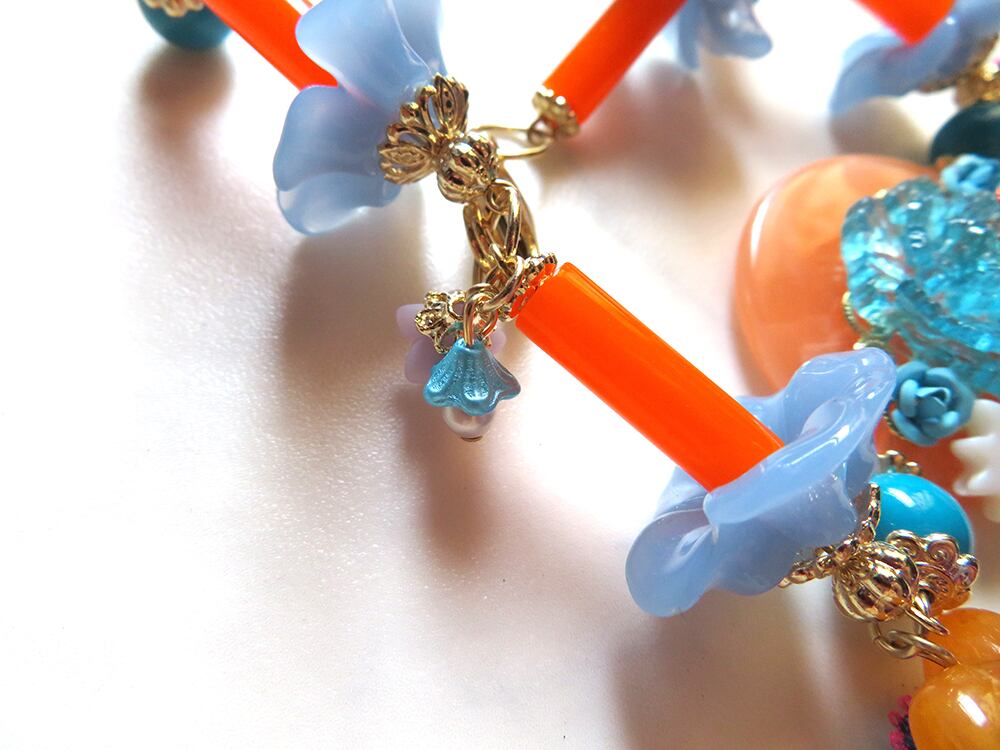 カラフルなアクリルやプラビーズを多用していますが、チープにならない様に差し色のゴールドやチェコ、アメリカのハンドメイドのガラスビーズ等を使用して、大人の女性が気軽に着けられる遊び心あるディテールに仕上げました。