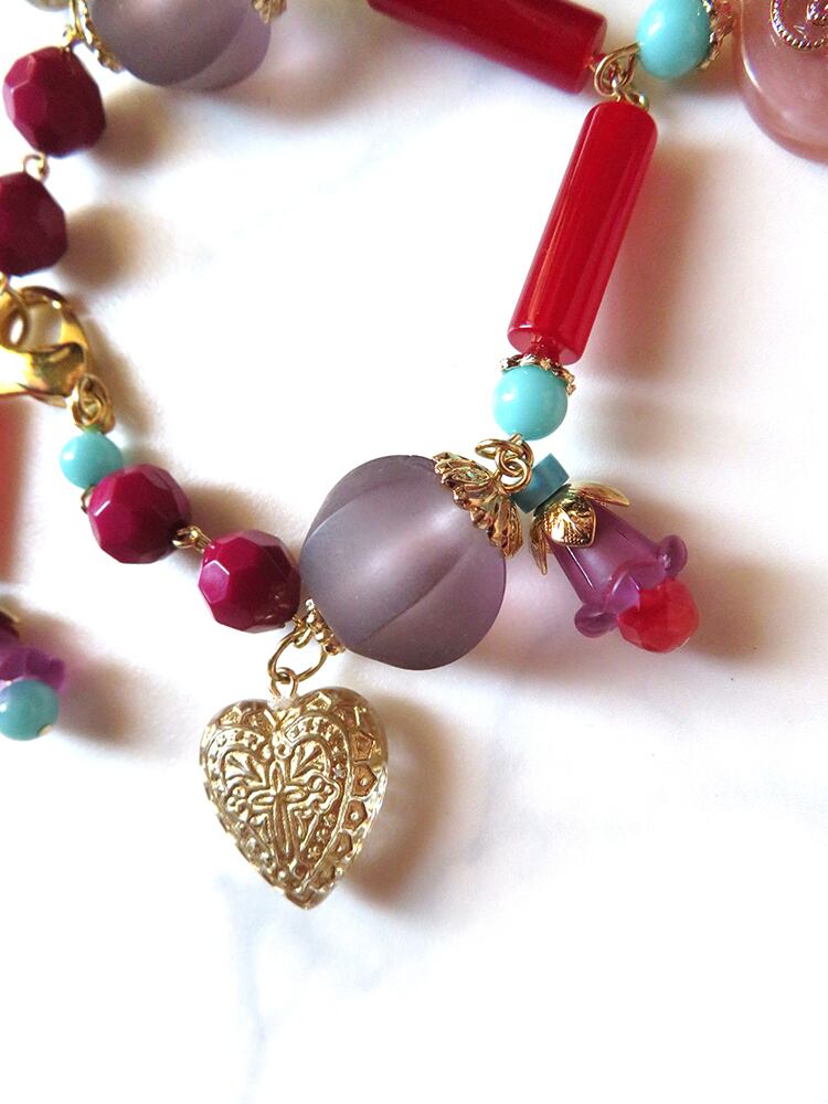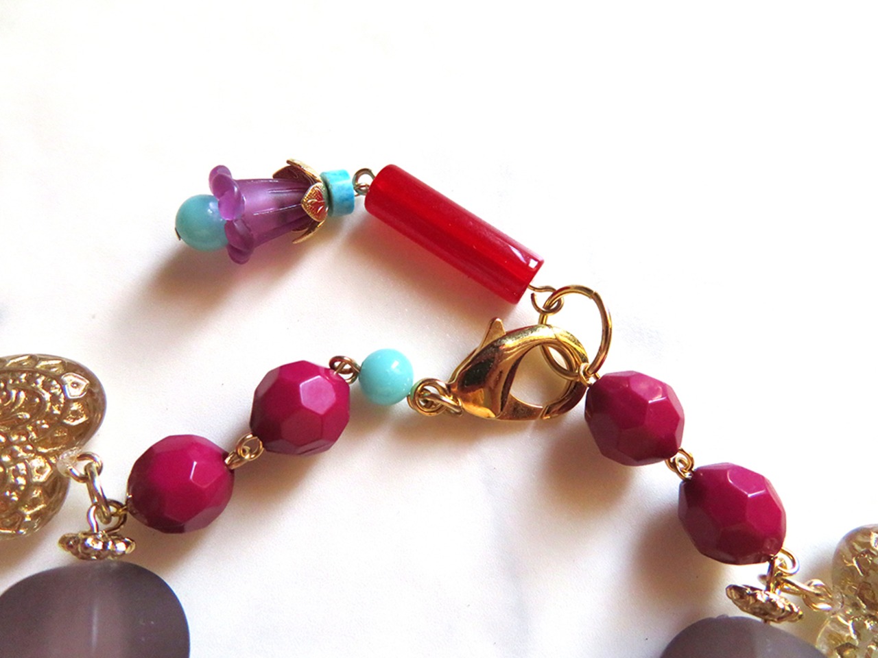 カラフルなアクリルやプラビーズを多用していますが、チープにならない様に差し色のゴールドやチェコ、アメリカのハンドメイドのガラスビーズ等を使用して、大人の女性が気軽に着けられる遊び心あるディテールに仕上げました。