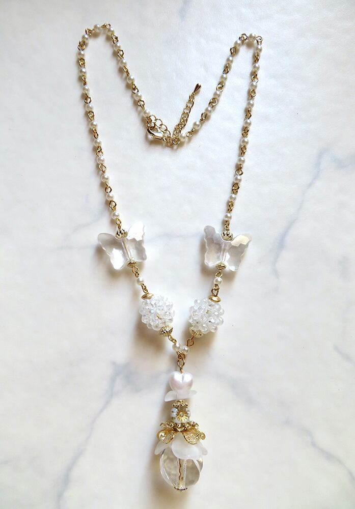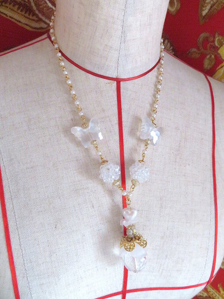 クリアやフロストが美しいドイツビーズをメインに、アクリル、プラ、チェコ硝子、ヴィンテージビーズ等をふんだんに使用し、夏の気分を薄荷水の様に爽やかに盛り上げてくれるクリアデザインを制作しました。