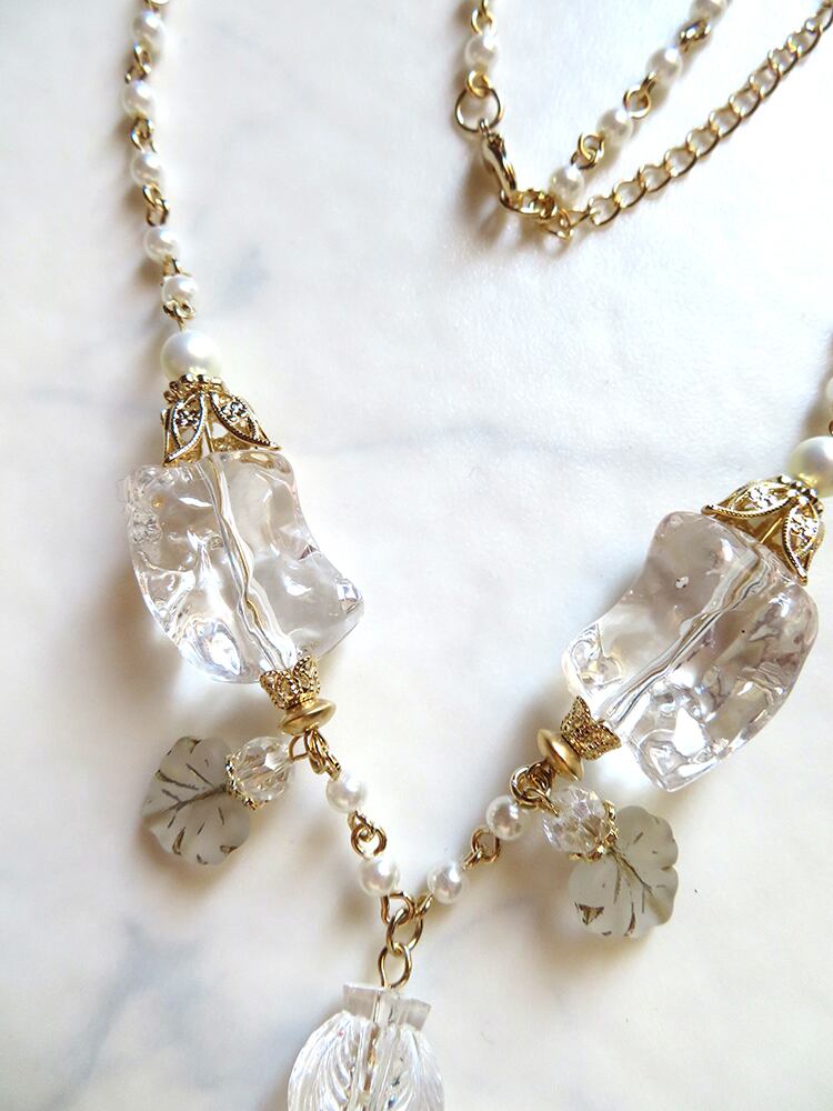 クリアやフロストが美しいドイツビーズをメインに、アクリル、プラ、チェコ硝子、ヴィンテージビーズ等をふんだんに使用し、夏の気分を薄荷水の様に爽やかに盛り上げてくれるクリアデザインを制作しました。