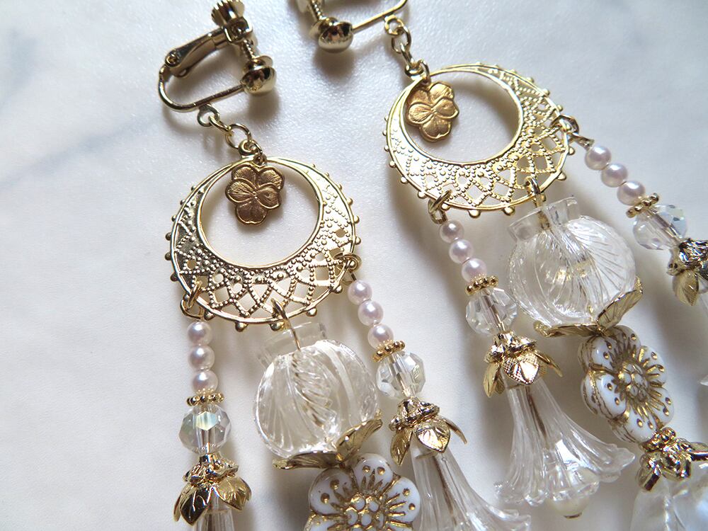クリアやフロストが美しいドイツビーズをメインに、アクリル、プラ、チェコ硝子、ヴィンテージビーズ等をふんだんに使用し、夏の気分を薄荷水の様に爽やかに盛り上げてくれるクリアデザインを制作しました。