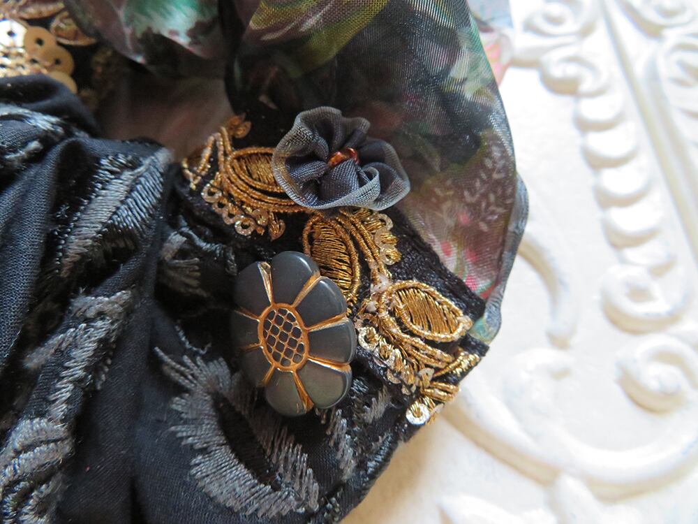 ボタニカル柄のオーガンジーと贅沢な刺繍生地を使用し、海外などで購入してきたボタンやフラワーモチーフをコラージュして制作しました。